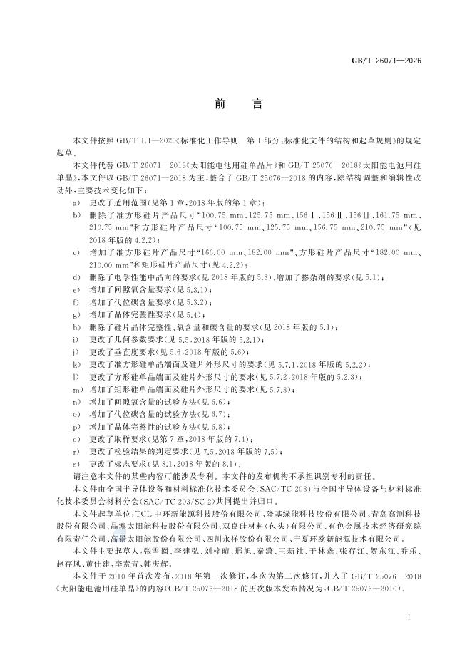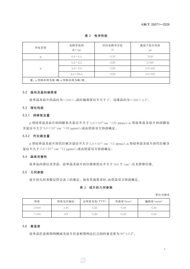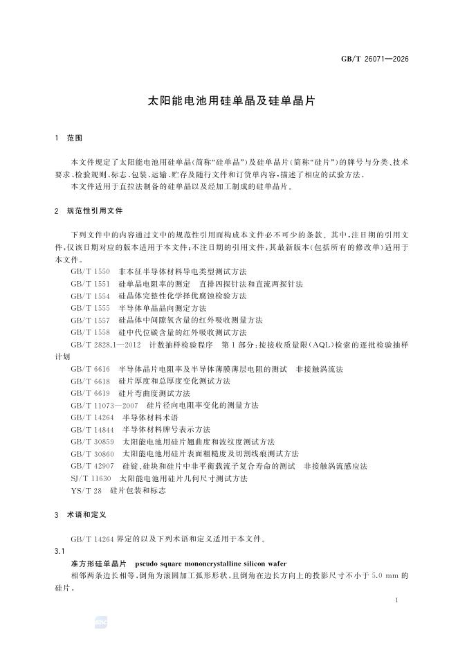 GB/T 26071-2026 太阳能电池用硅单晶及硅单晶片