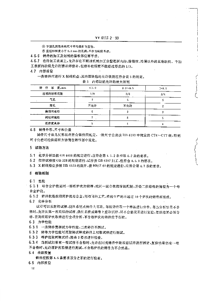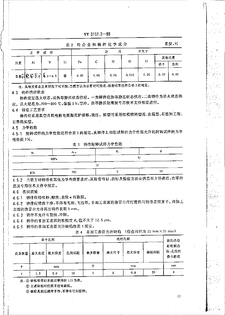 YY 0117.2-1993 外科植入物骨关节假体锻、铸件ZTiAI6V4钛合金铸件