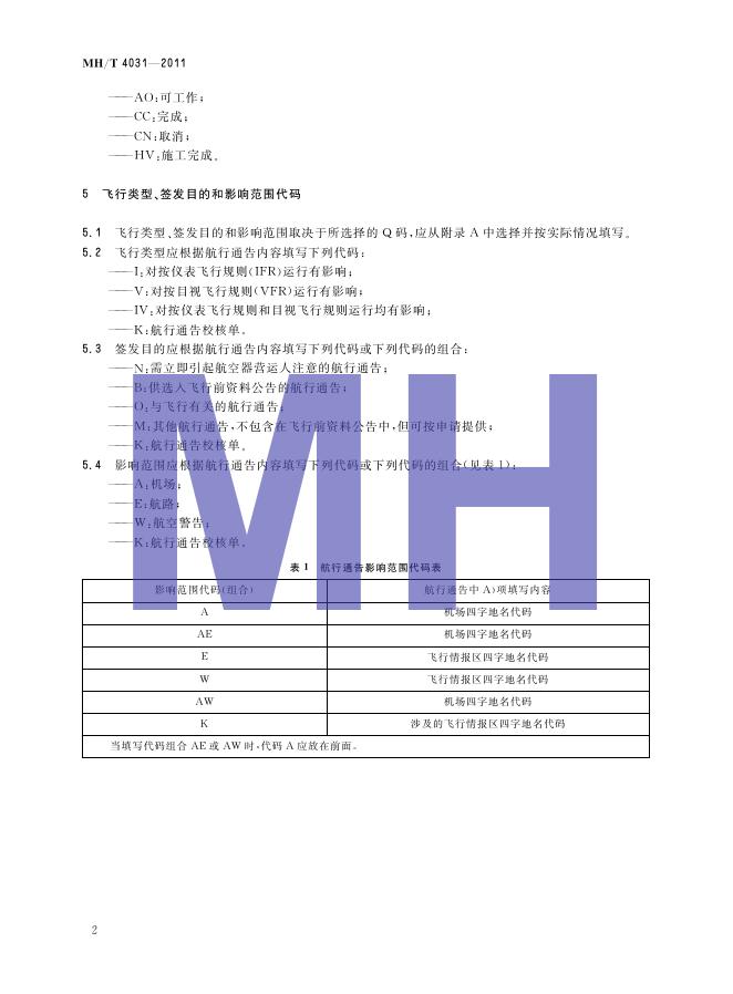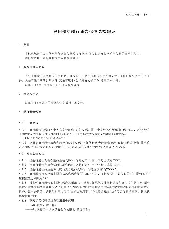 MH/T 4031-2011 民用航空航行通告代码选择规范