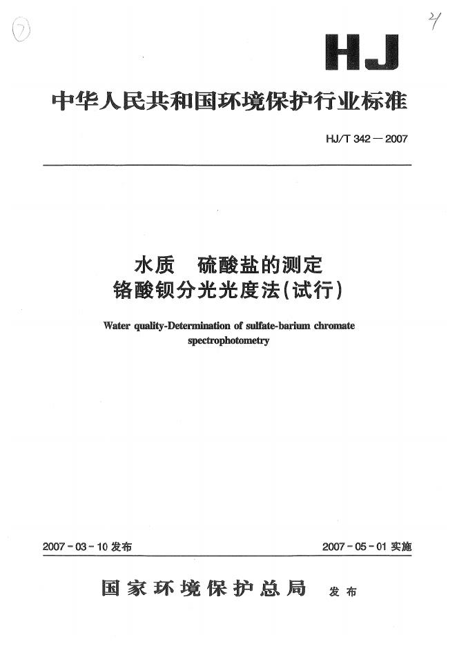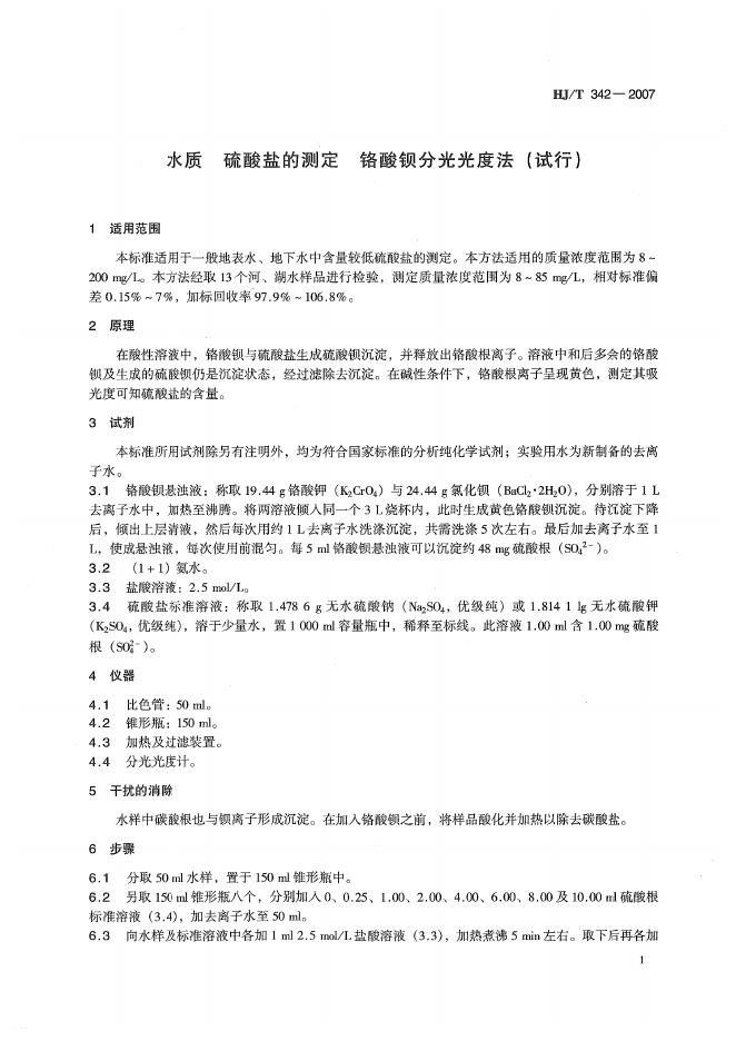 HJ/T 342-2007 水质 硫酸盐的测定 铬酸钡分光光度法(试行)