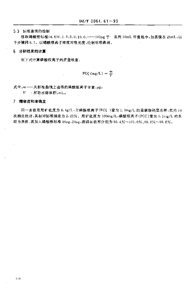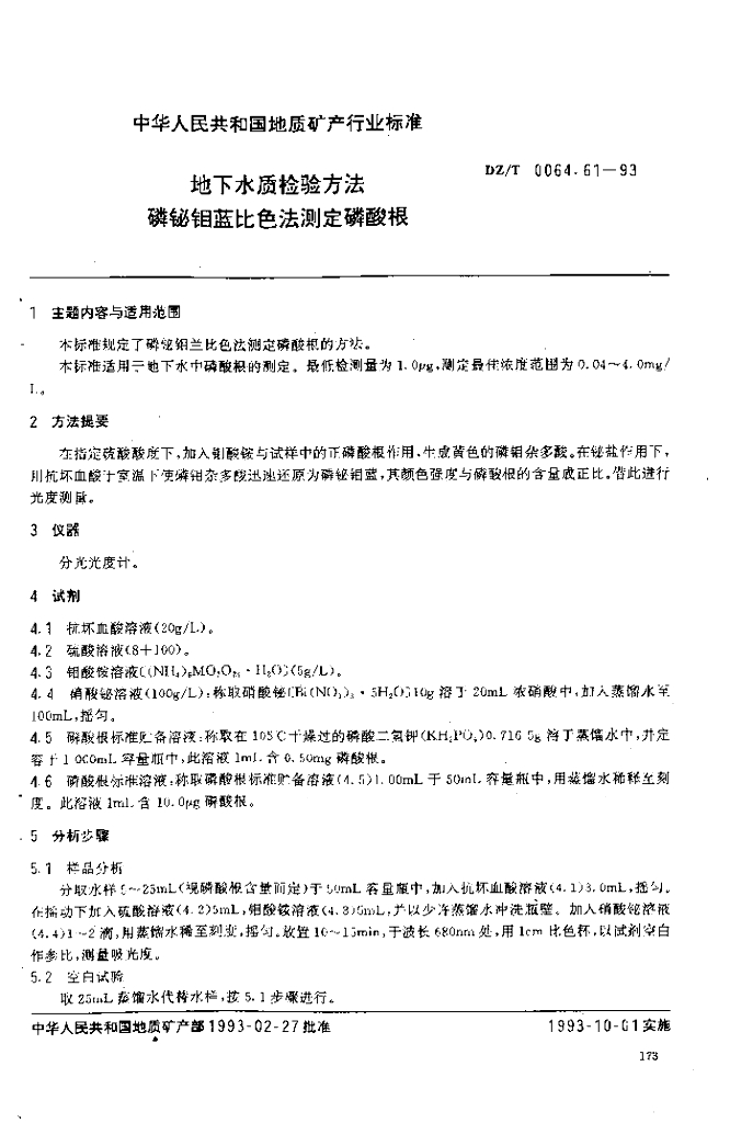 DZ/T 0064.61-1993 地下水质检验方法 磷铋钼蓝比色法测定磷酸根