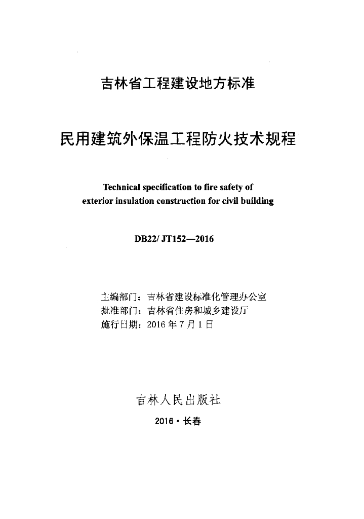 DB22/JT 152-2016 民用建筑外保温工程防火技术规程