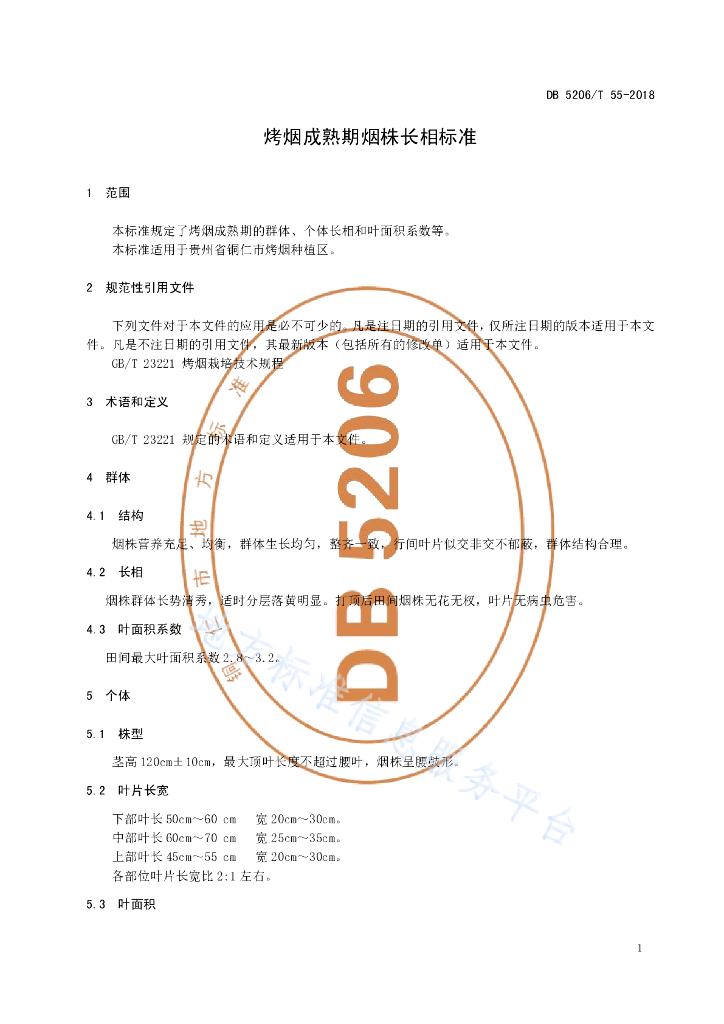 DB5206/T 55-2018 烤烟成熟期烟株长相标准