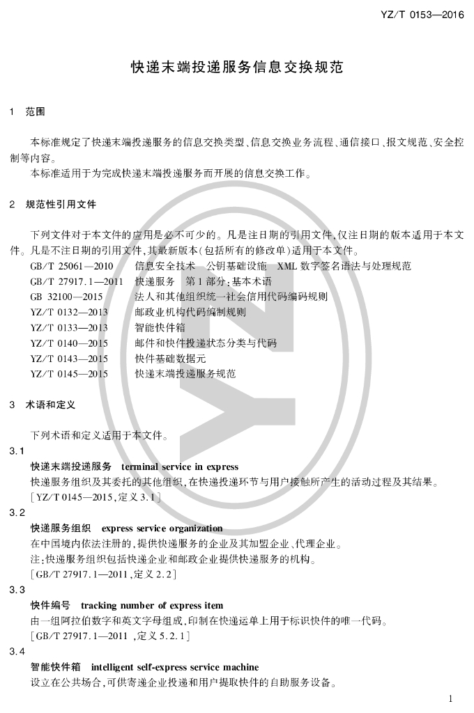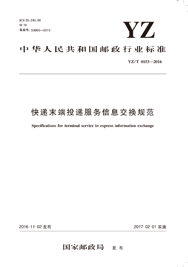 YZ/T 0153-2016 快递末端投递服务信息交换规范