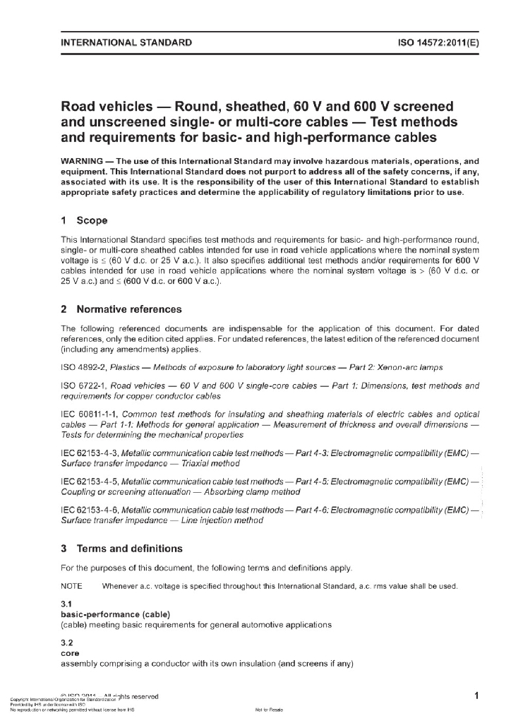 ISO 14572:2011 道路电缆60V和600V屏蔽和非屏蔽的单芯或多芯圆形护套电缆-基本性能和高性能电缆的试验方法和要求