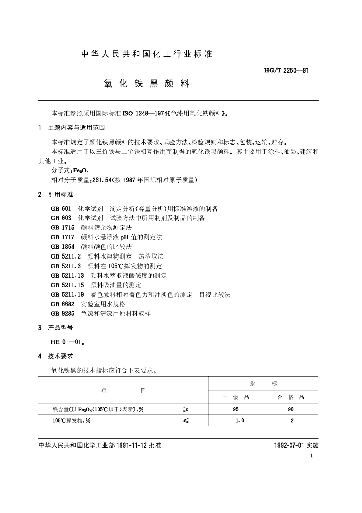 HG/T 2250-1991 氧化铁黑颜料