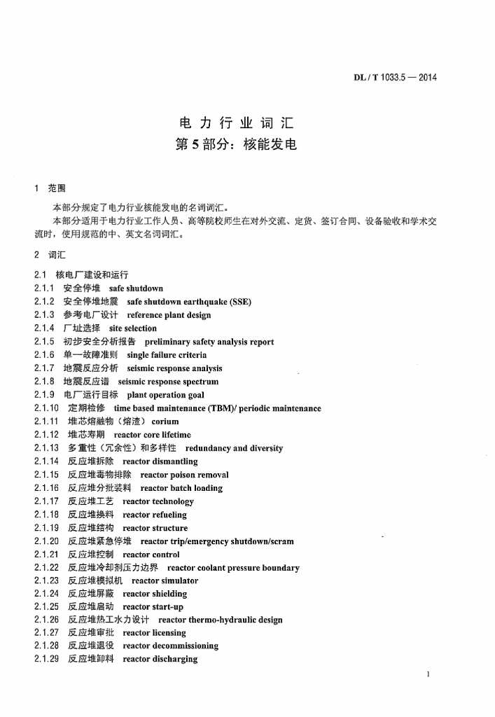 DL/T 1033.5-2014 电力行业词汇 第5部分:核能发电