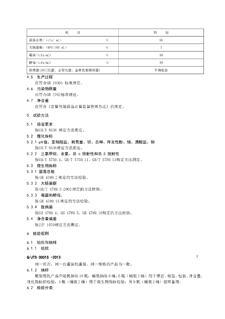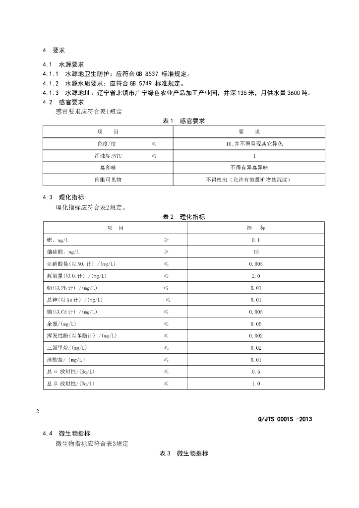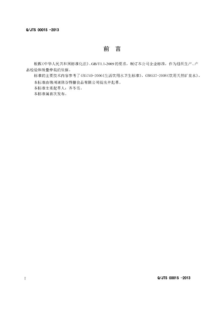 Q/JTS 0001S-2013 锦州道隐谷特膳食品有限公司 饮用山泉水