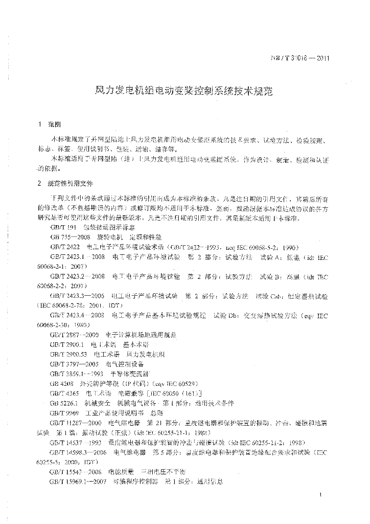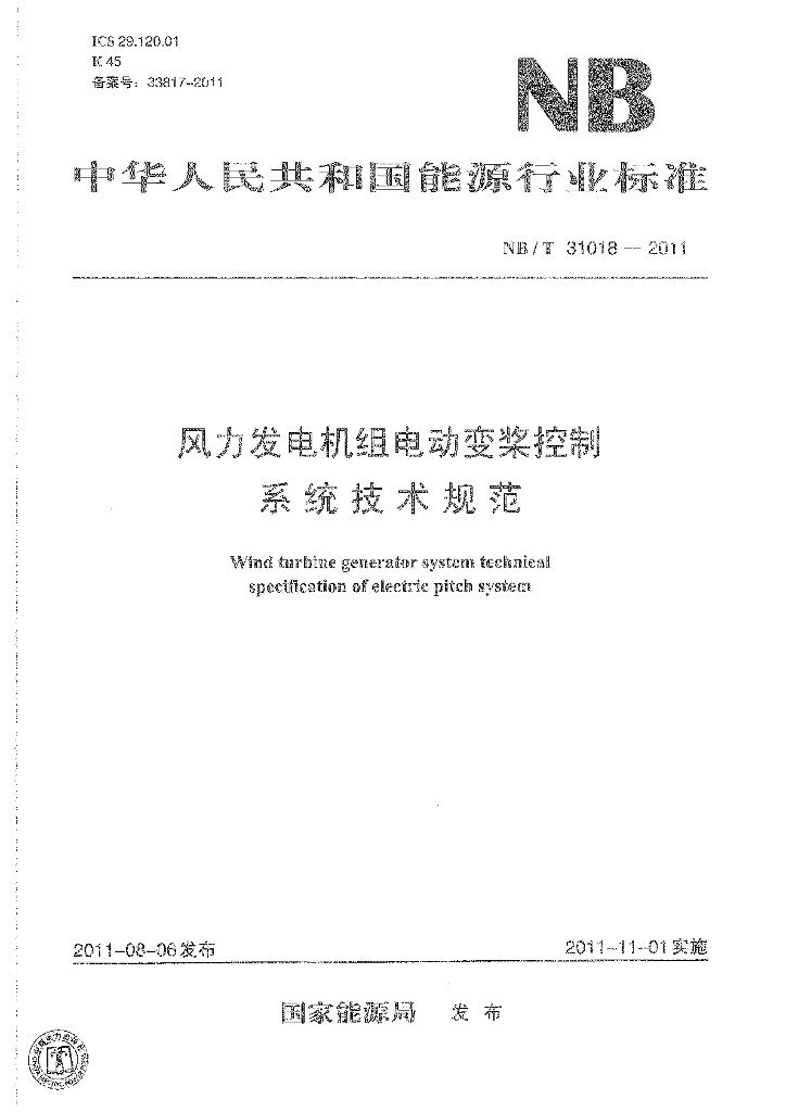 NB/T 31018-2011 风力发电机组电动变桨控制系统技术规范