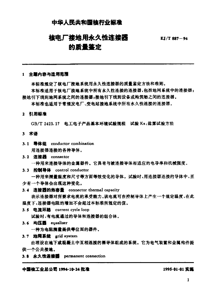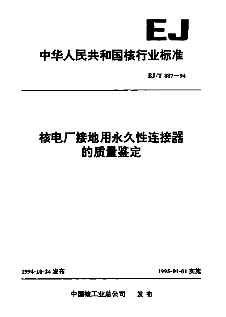 EJ/T 887-1994 核电厂接地用永久性连接器的质量鉴定