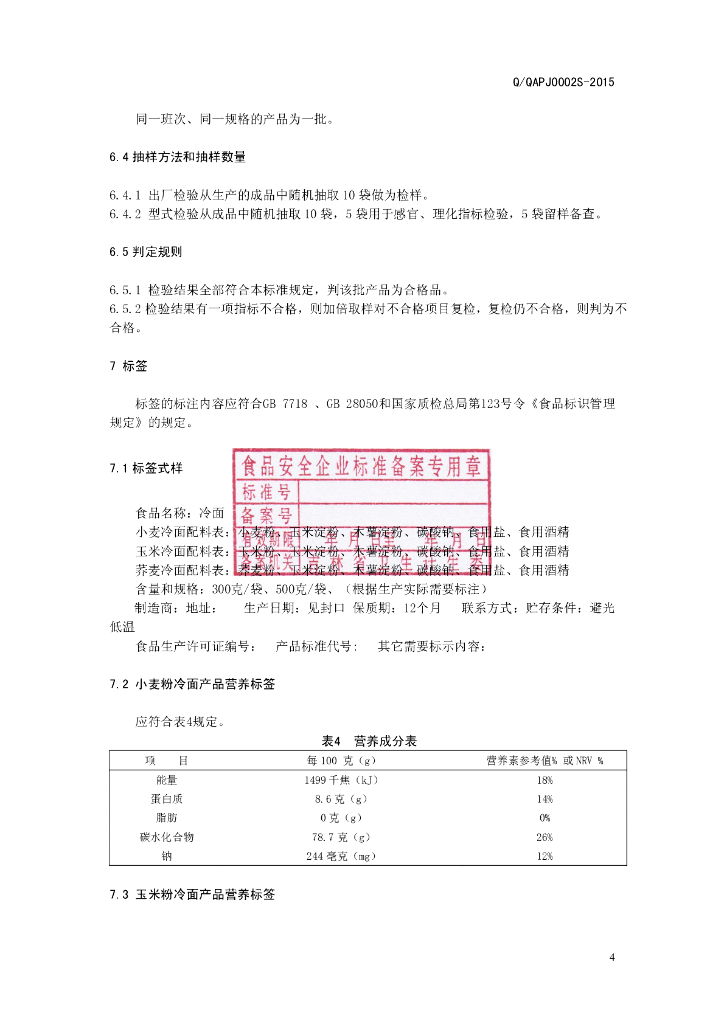 Q/QAPJ 0002S-2015 乾安县潘家食品有限公司 冷面