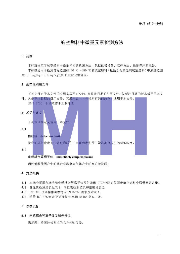 MH/T 6117-2018 航空燃料中微量元素检测方法