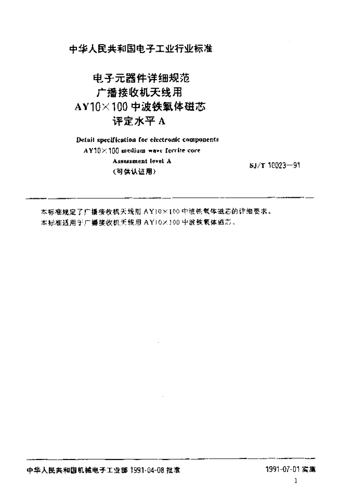 SJ/T 10023-1991 电子元器件详细规范 广播接收机天线用AY10x100中波铁氧体磁芯评定水平A(可供认证用)