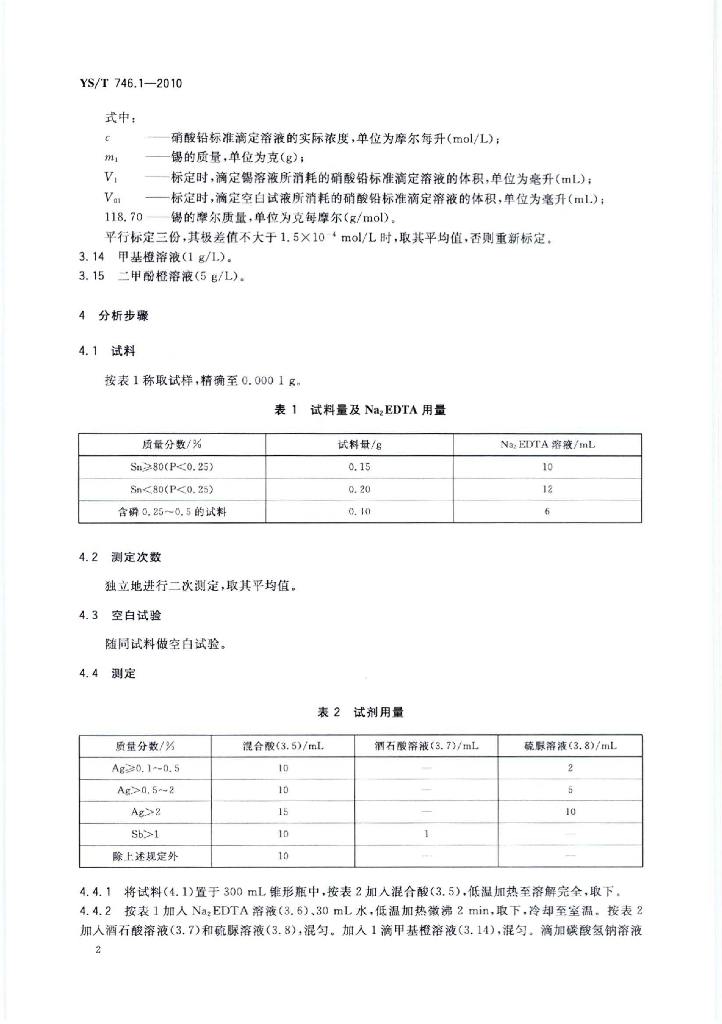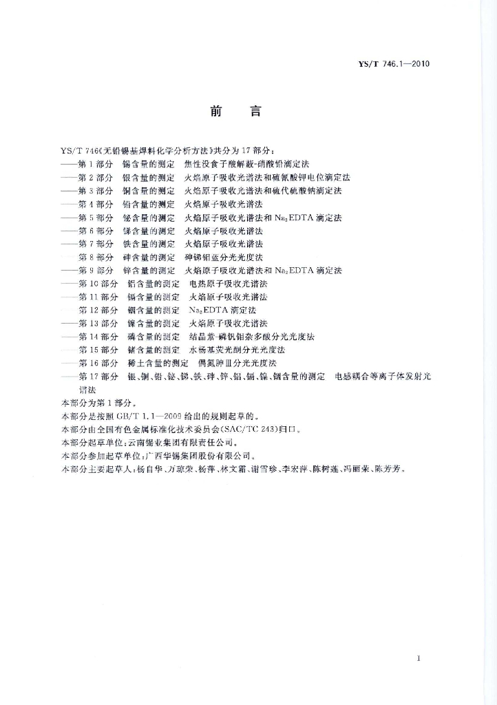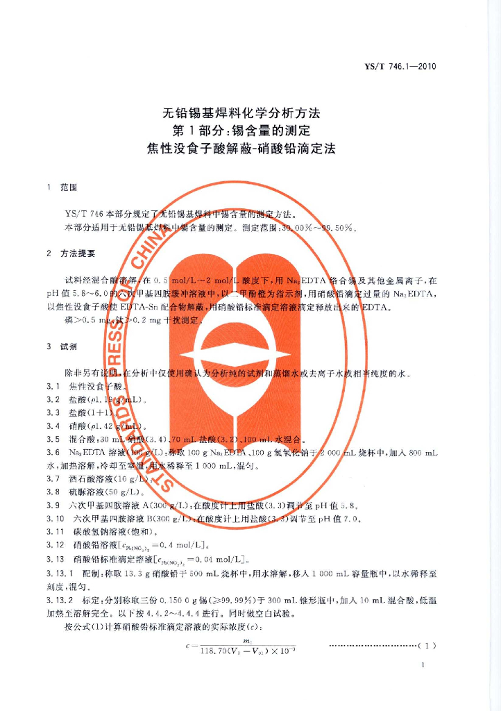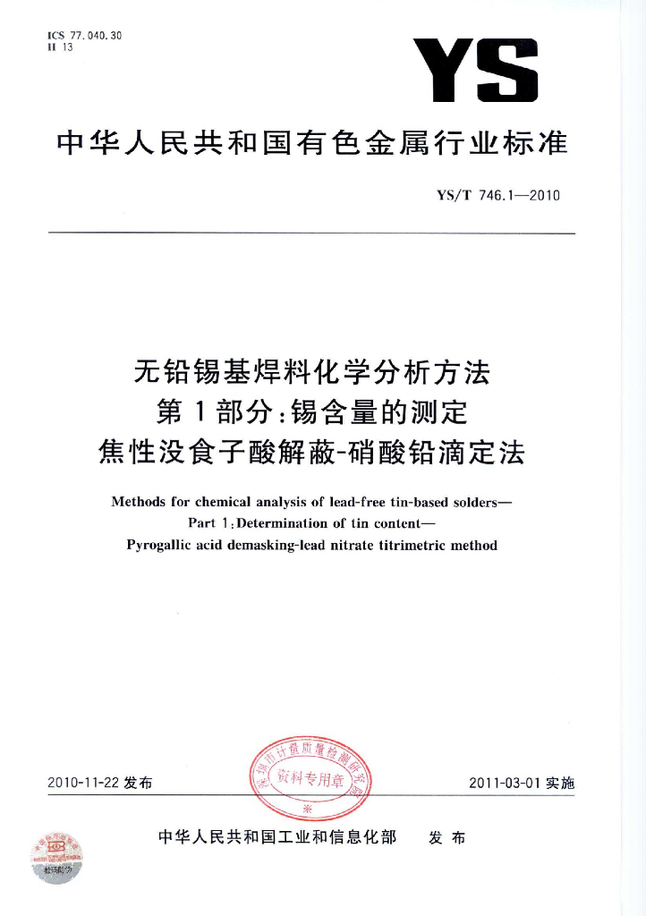 YS/T 746.1-2010 无铅锡基焊料化学分析方法 第1部分:锡含量的测定 焦性没食子酸解蔽—硝酸铅滴定法