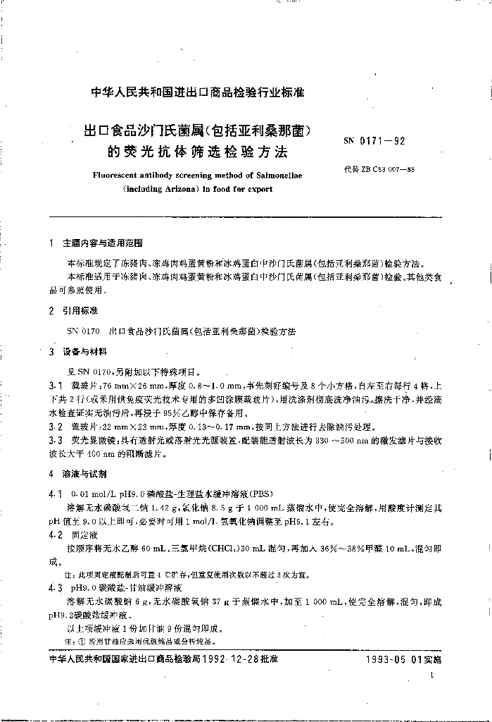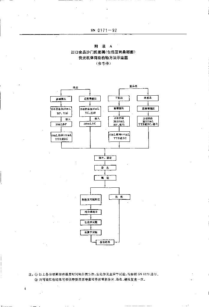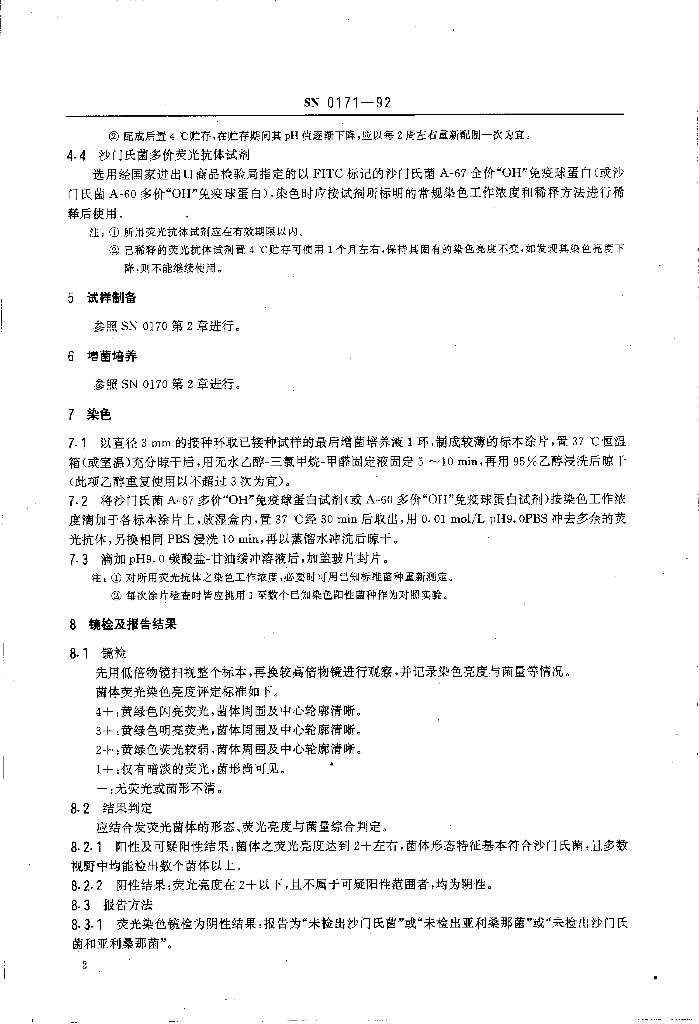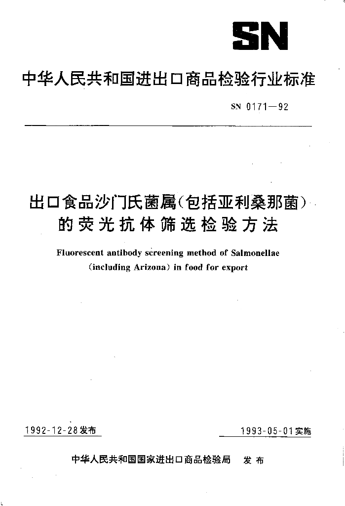 SN 0171-1992 出口食品沙门氏菌属(包括亚利桑那菌)的荧光抗体筛选检验方法