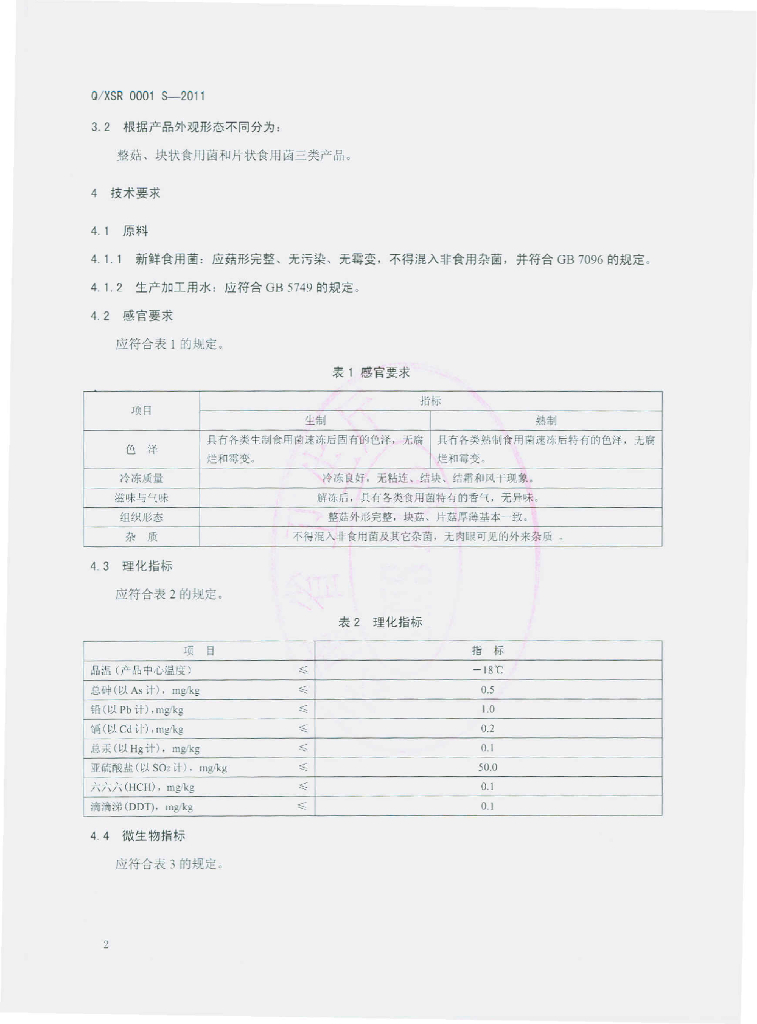 Q/XSR 0001S-2011 速冻食用菌