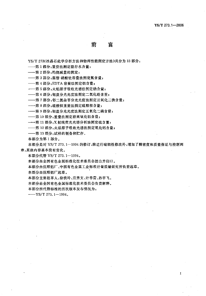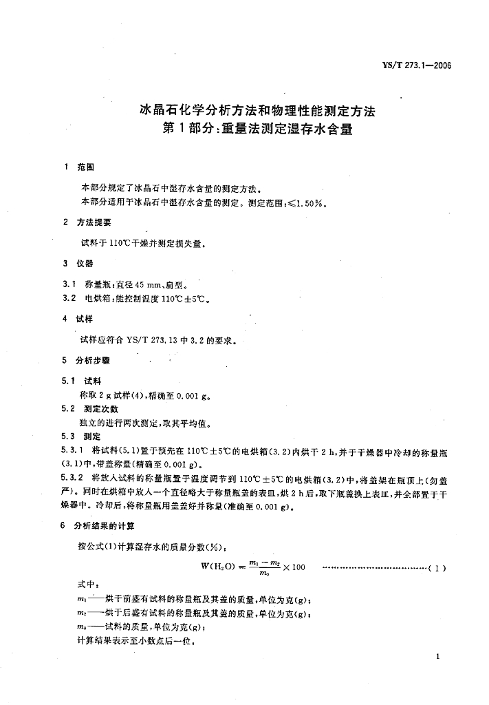 YS/T 273.1-2006 冰晶石化学分析方法和物理性能测定方法 第1部分:重量法测定湿存水含量