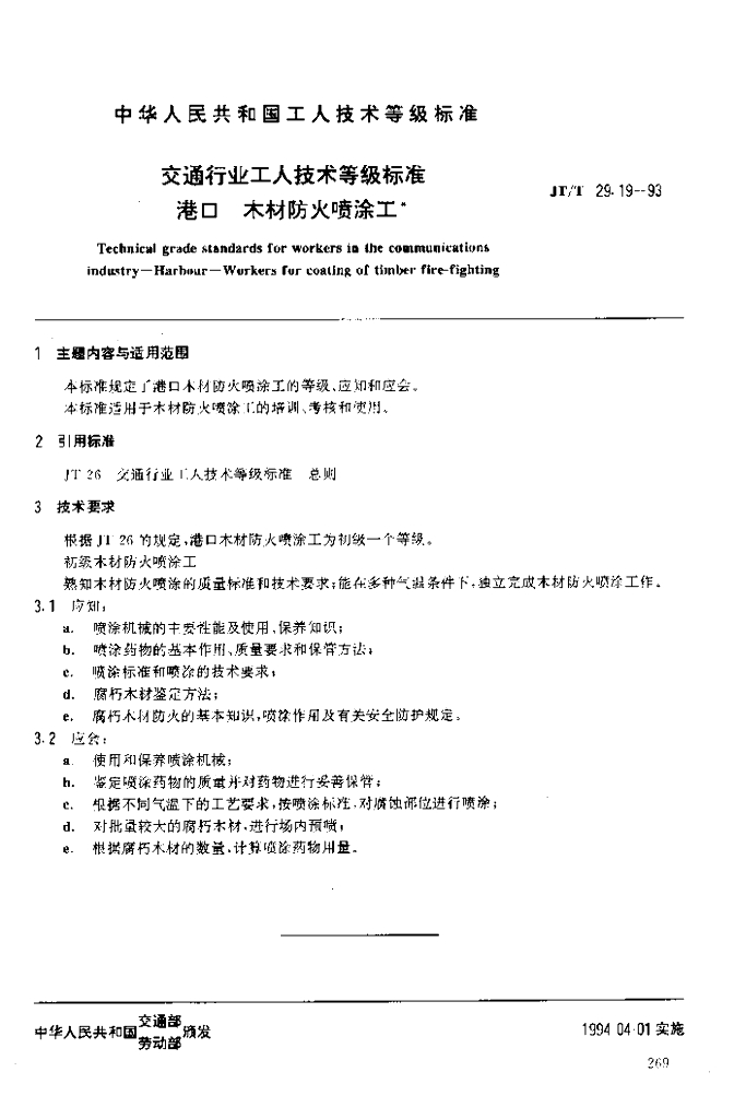 JT/T 29.19-1993 交通行业工人技术等级标准港口木材防火喷涂工
