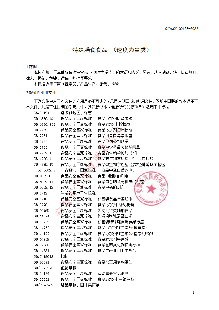Q/YGGY 0015S-2022 特殊膳食食品(速度力量类)