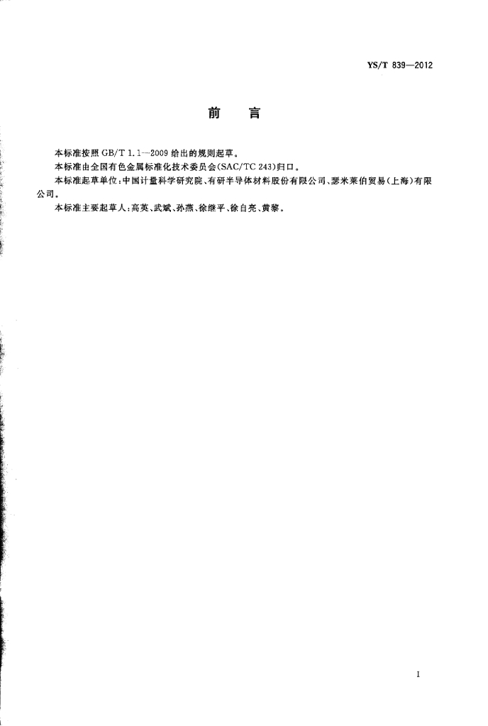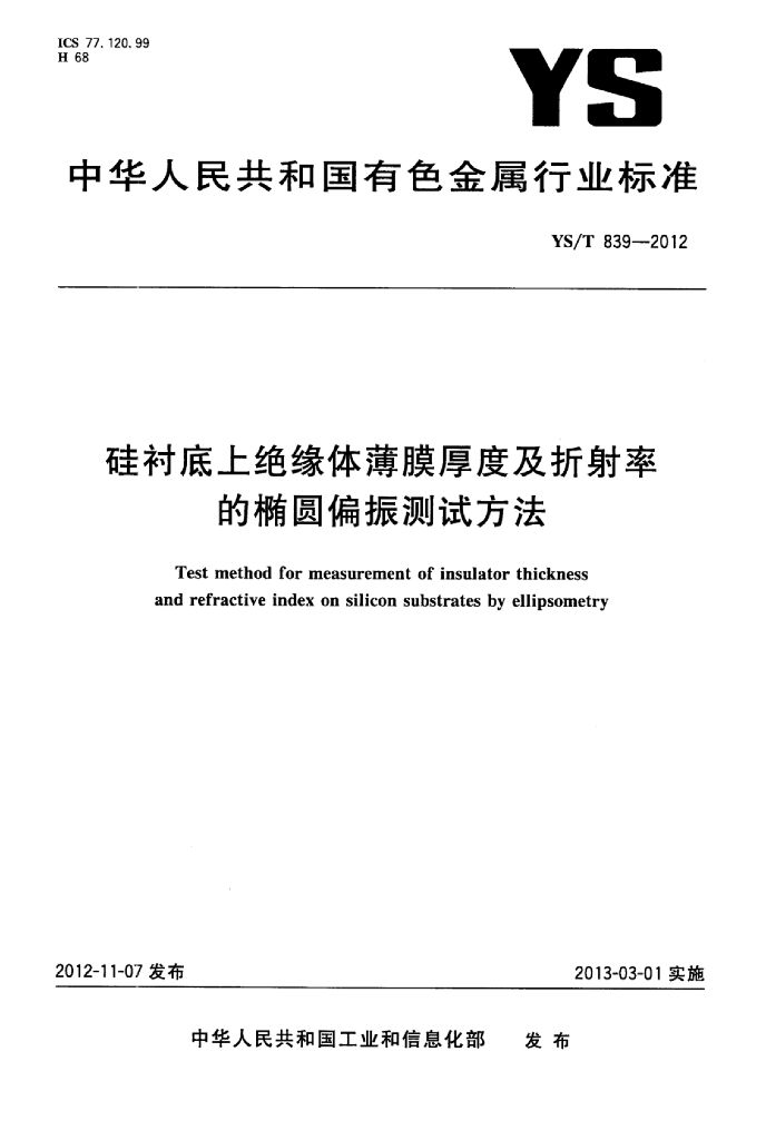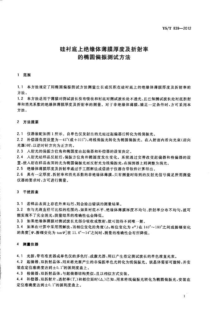 YS/T 839-2012 硅衬底上绝缘体薄膜厚度及折射率的椭圆偏振测试方法