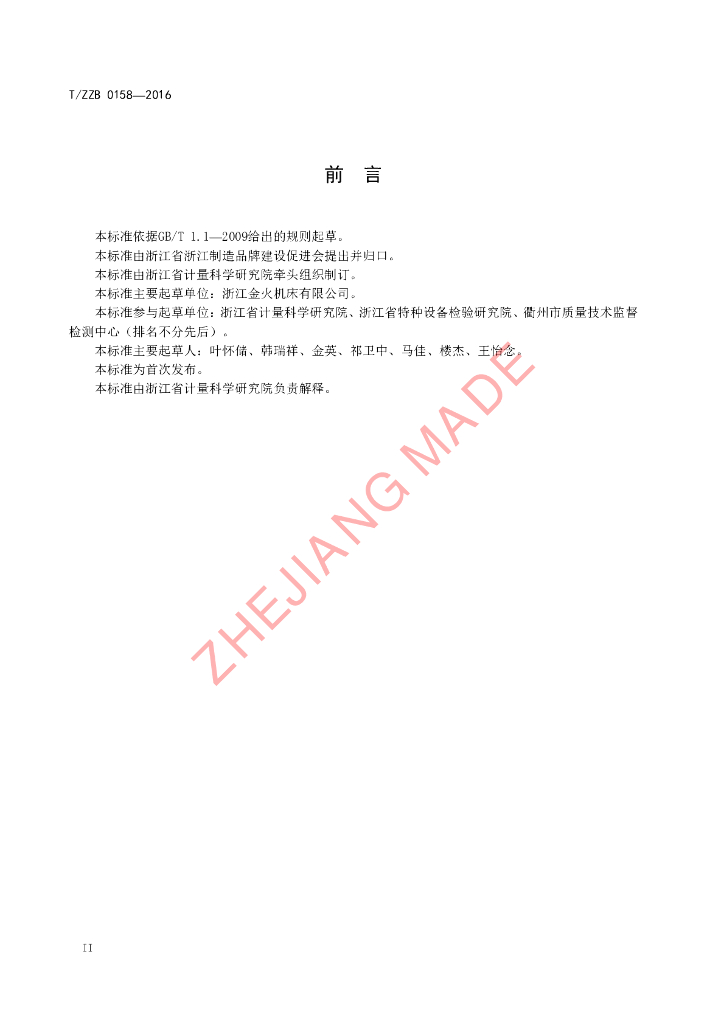 本标准由浙江省计量科学研究院牵头组织制订。、本标准主要起草单位:浙江金火机床有限公司。、本标准参与起草单位:浙江省计量科学研究院、浙江省特种设备检验研究院、衢州市质量技术监督检测中心(排名不分先后)。