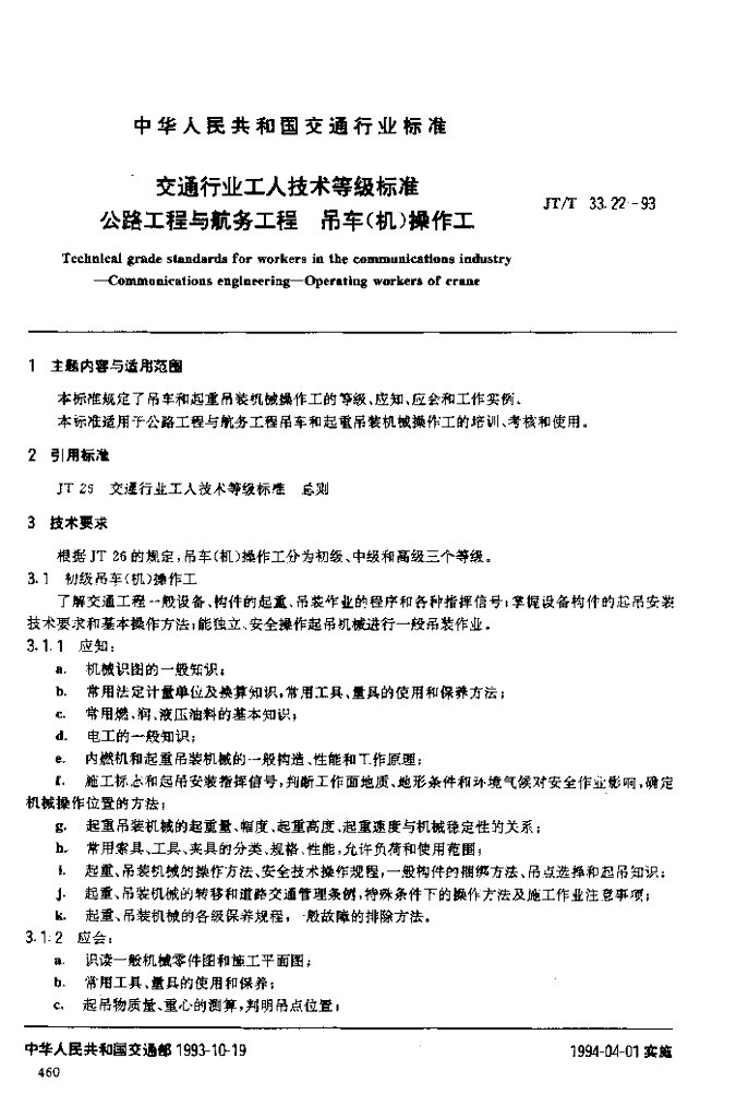 JT/T 33.22-1993 交通行业工人技术等级标准公路工程与航务工程吊车(机)操作工
