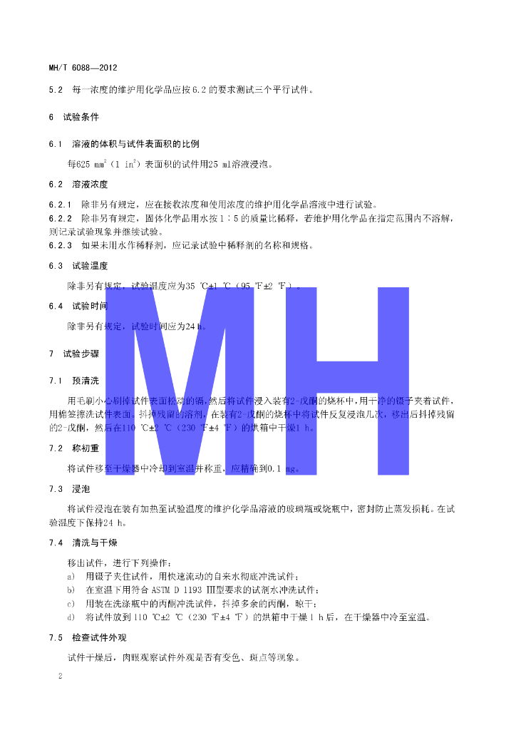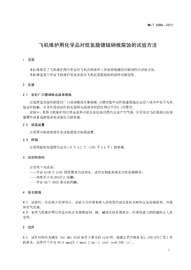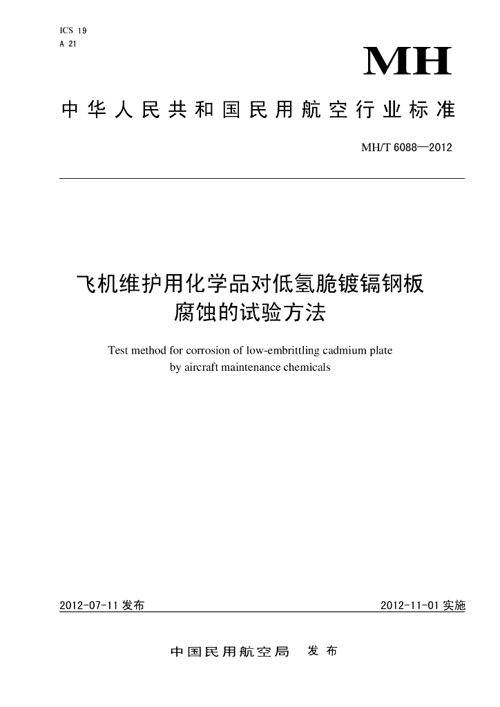 MH/T 6088-2012 飞机维护用化学品对低氢脆镀镉钢板腐蚀的试验方法