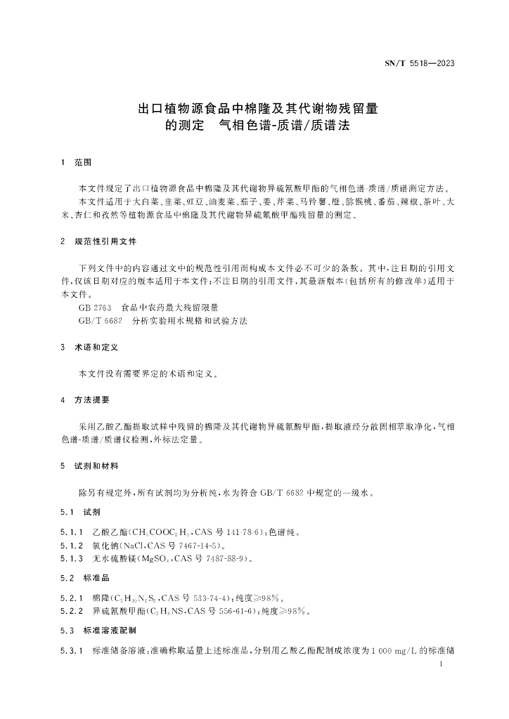 SN/T 5518-2023 出口植物源食品中棉隆及其代谢物残留量的测定 气相色谱-质谱/质谱法
