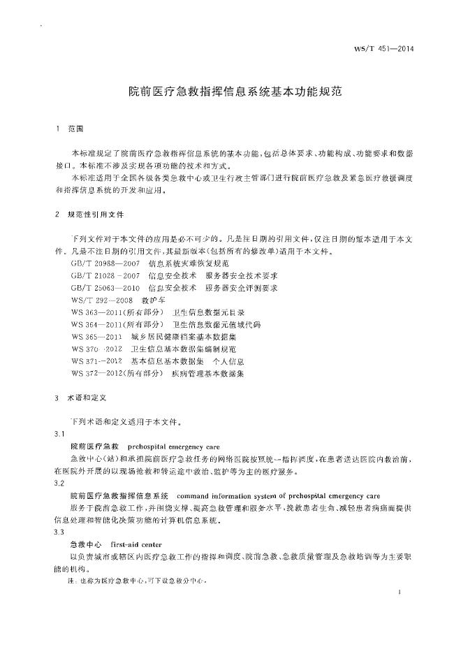 WS/T 451-2014 院前医疗急救指挥信息系统基本功能规范