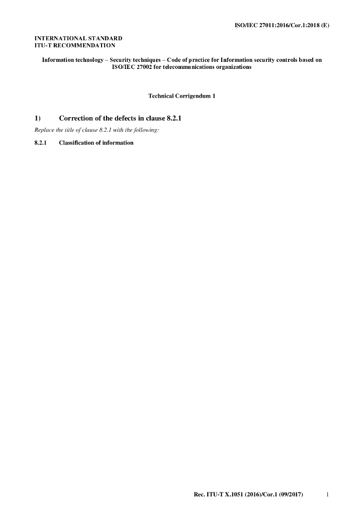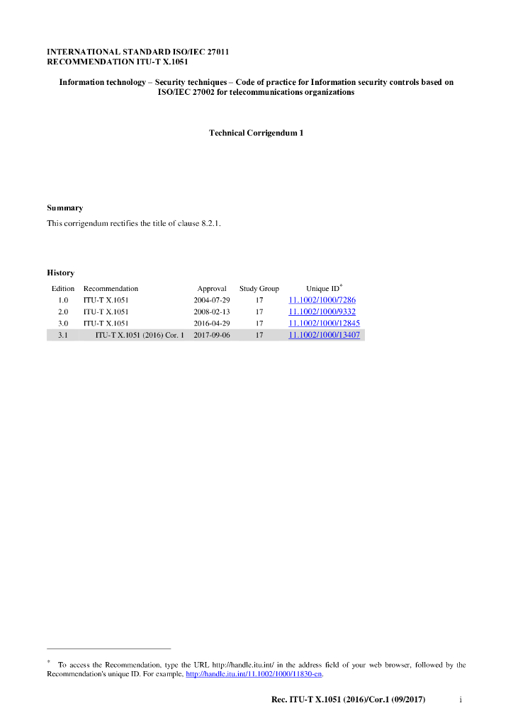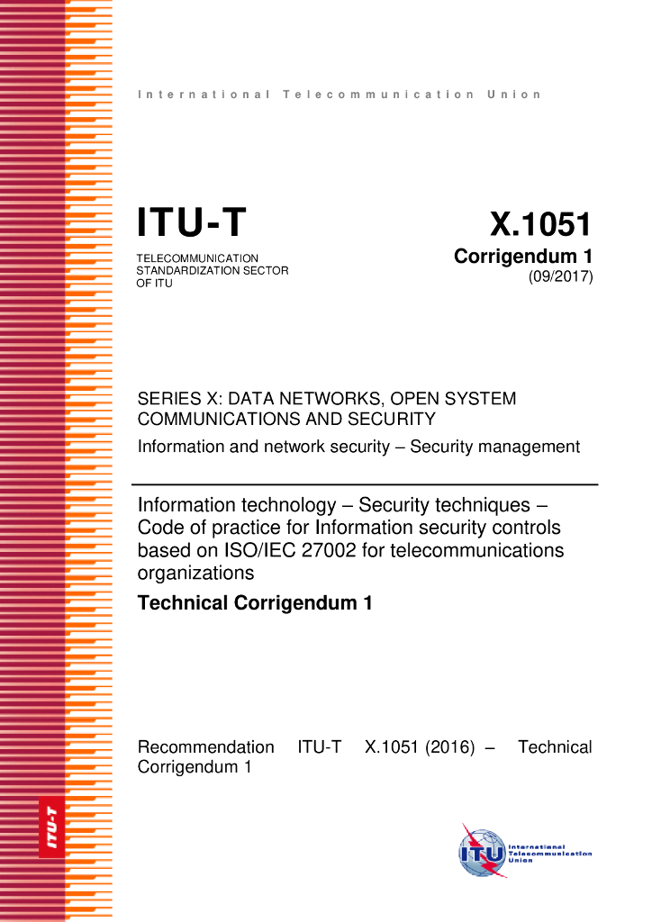 ITU-T X.1051-2016/Cor 1-2017 信息技术安全技术 ISO/IEC 27002信息安全控制实践准则