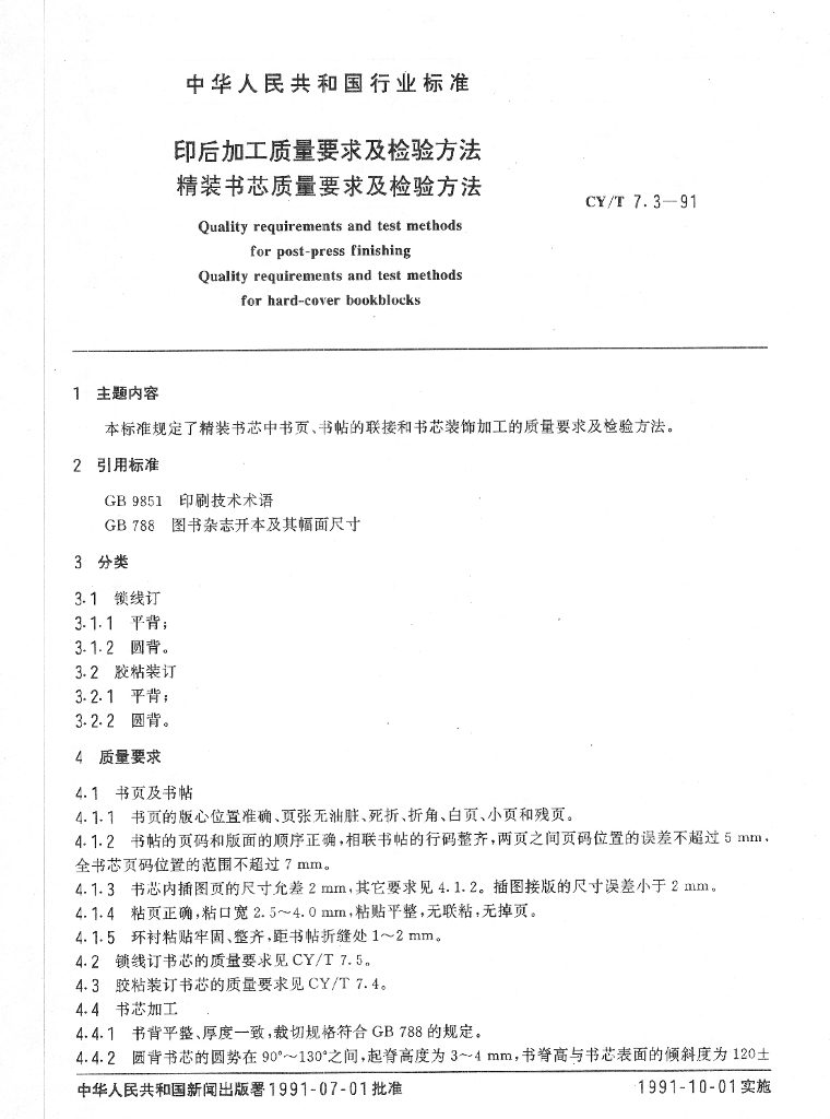 CY/T 7.3-1991 印后加工质量要求及检验方法 精装书芯质量要求及检验方法