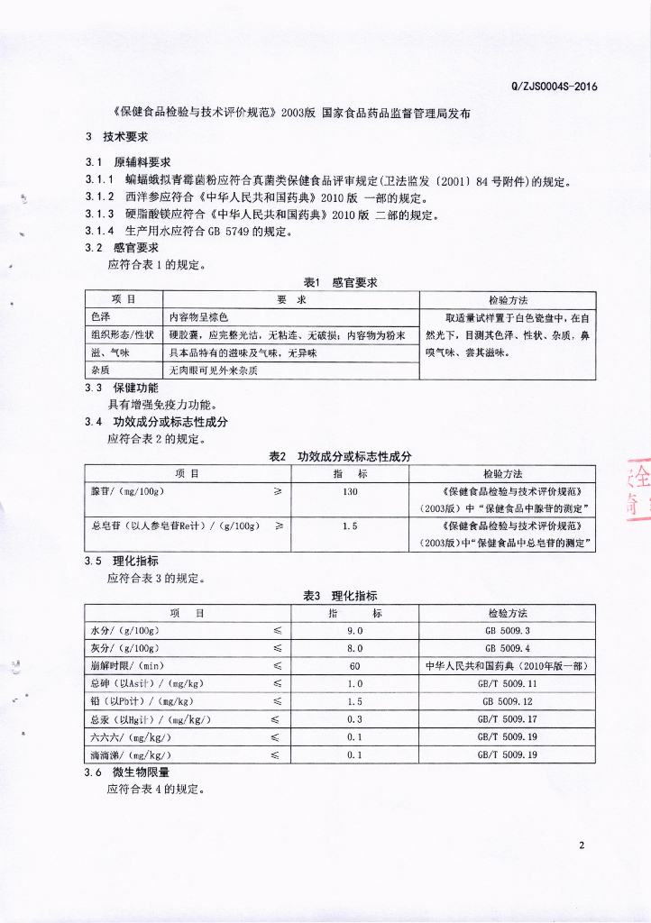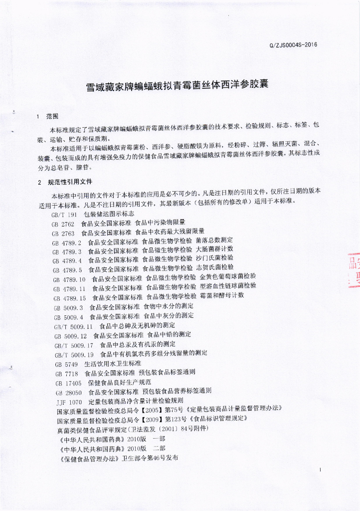 Q/ZJS 0004S-2016 成都藏家生物科技有限公司 雪域藏家牌蝙蝠蛾拟青霉菌丝体西洋参胶囊