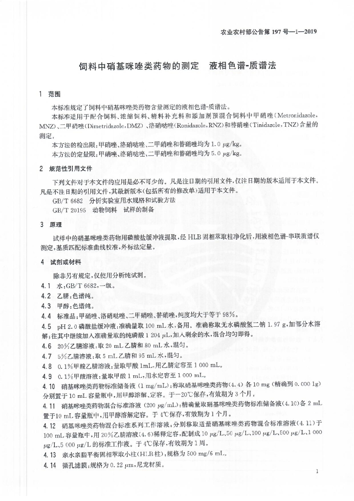 农业农村部公告第197号-1-2019 饲料中硝基咪唑类药物的测定 液相色谱-质谱法