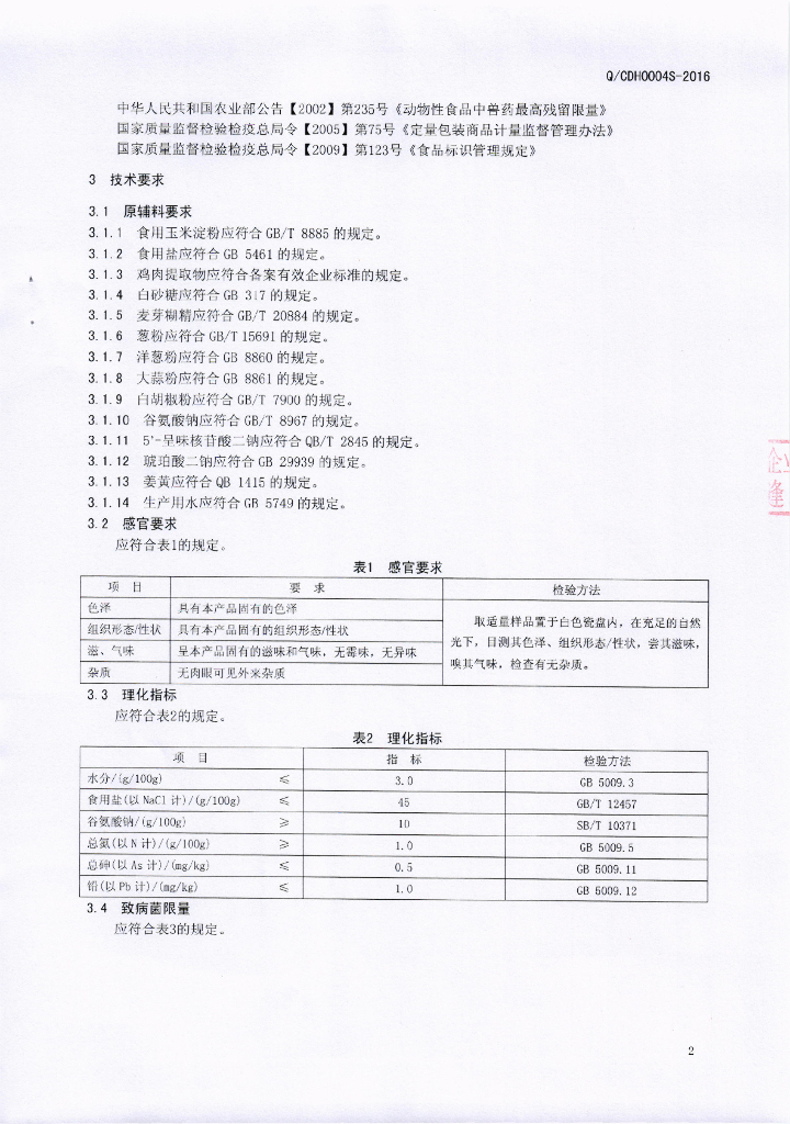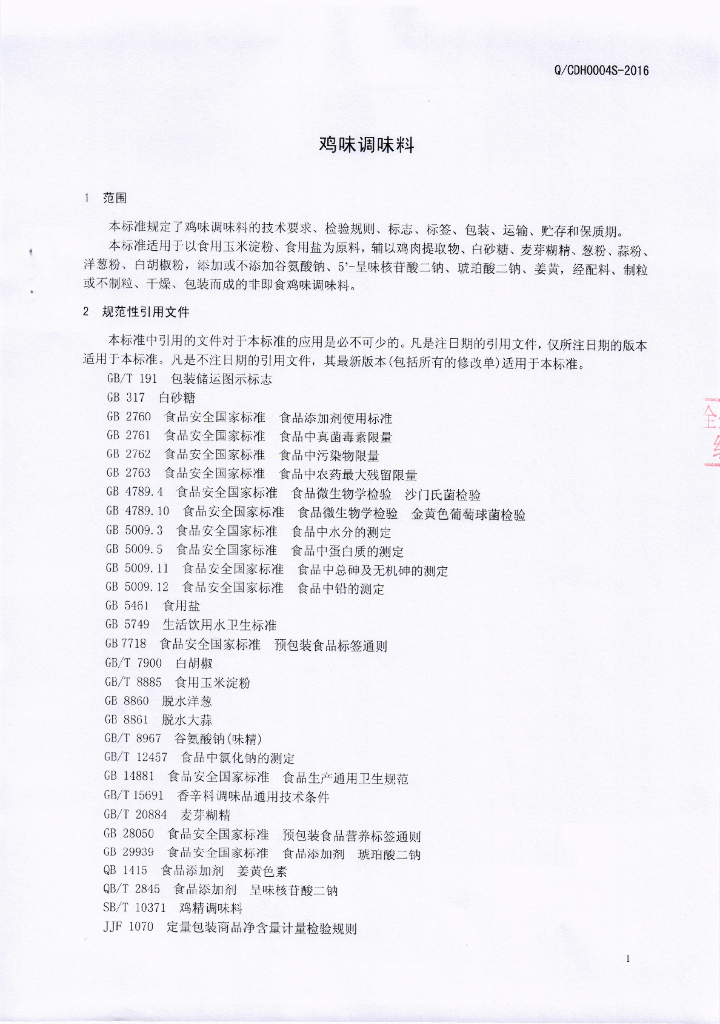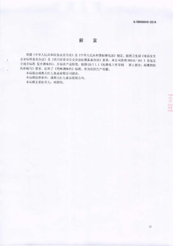 Q/CDH 0004S-2016 成都大红九食品有限公司 鸡味调味料
