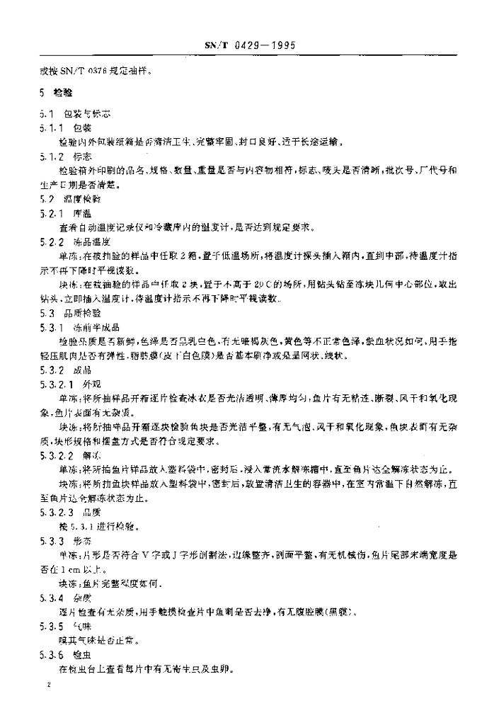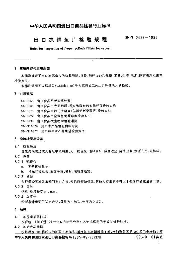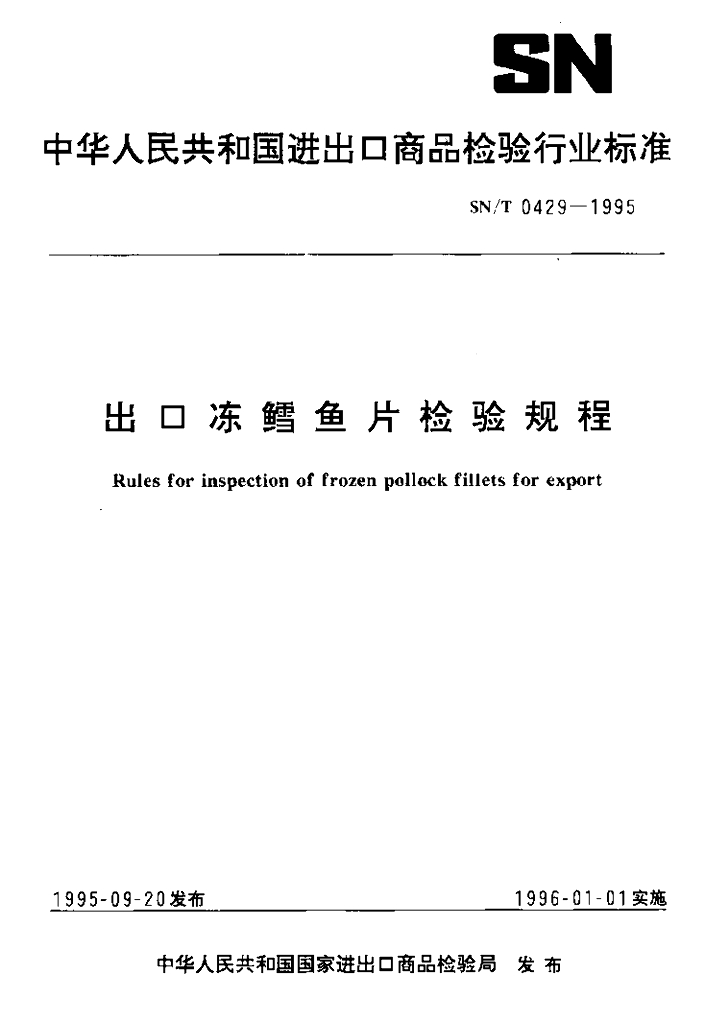 SN/T 0429-1995 出口冻鳕鱼片检验规程