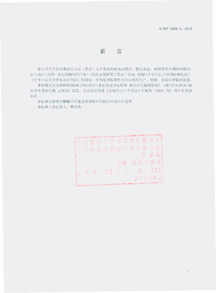 Q/QHY 0008S-2015 曲靖市麒麟区红源老家调味料有限公司 卤腐