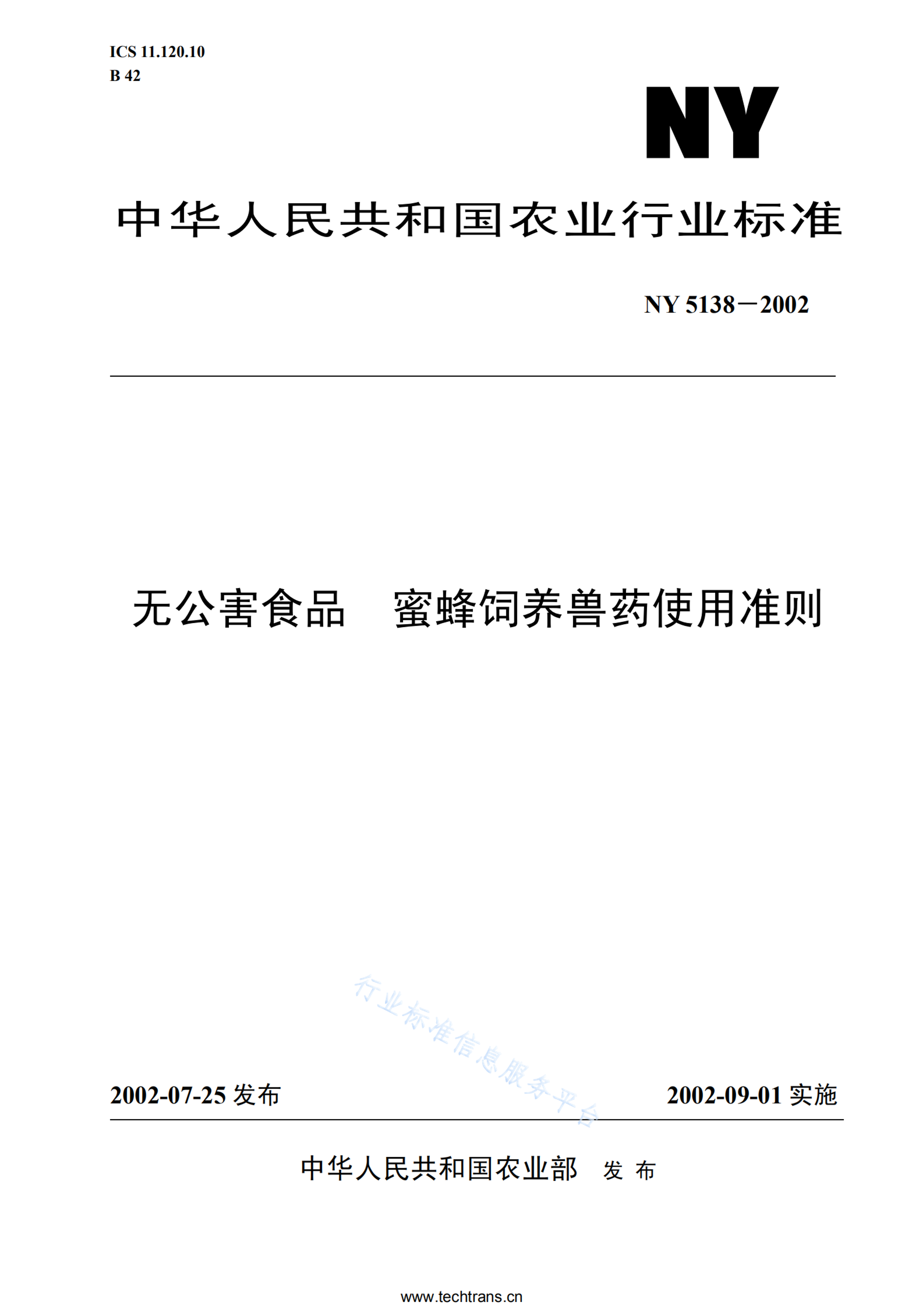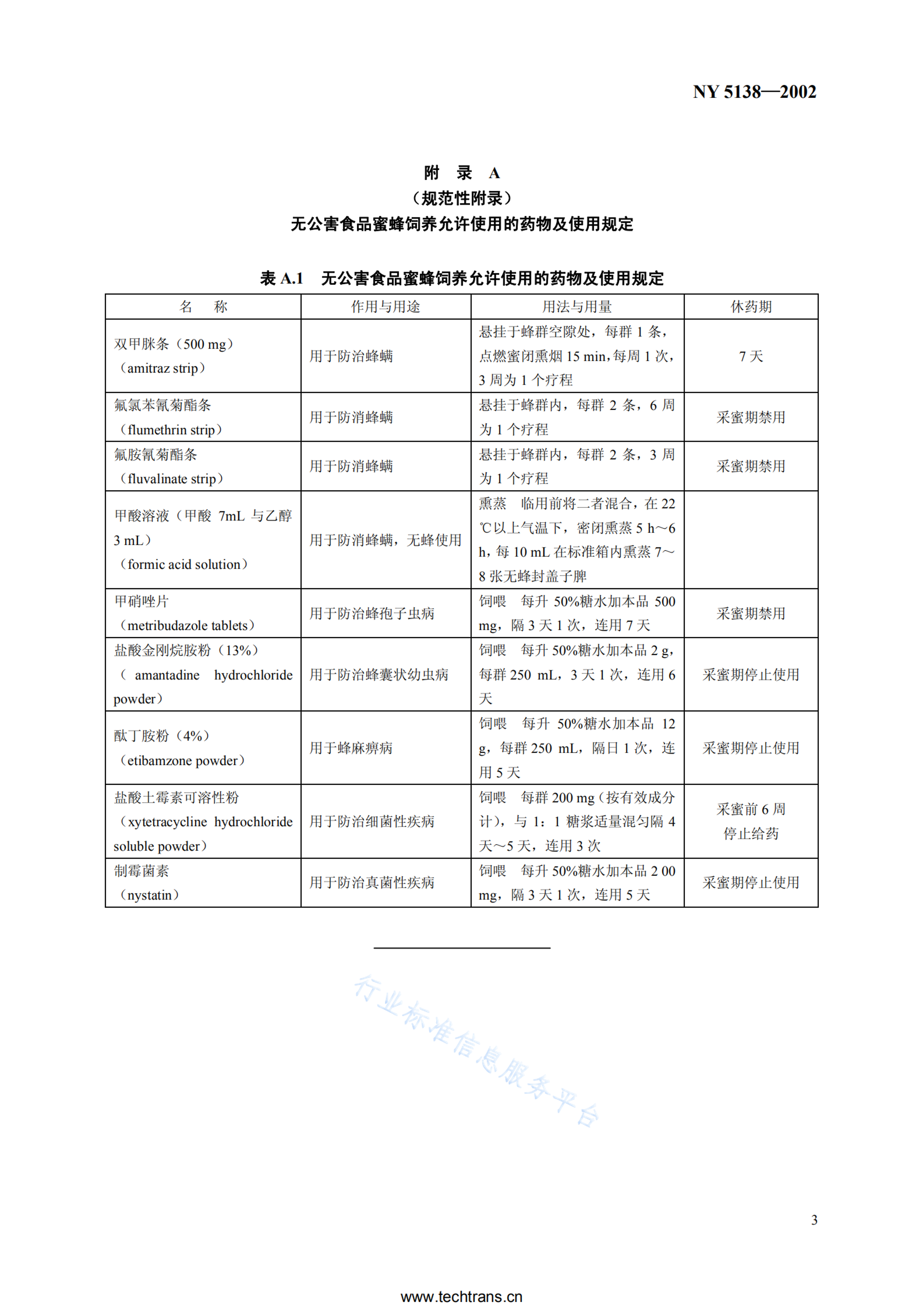 NY 5138-2002 无公害食品 蜜蜂饲养兽药使用准则
