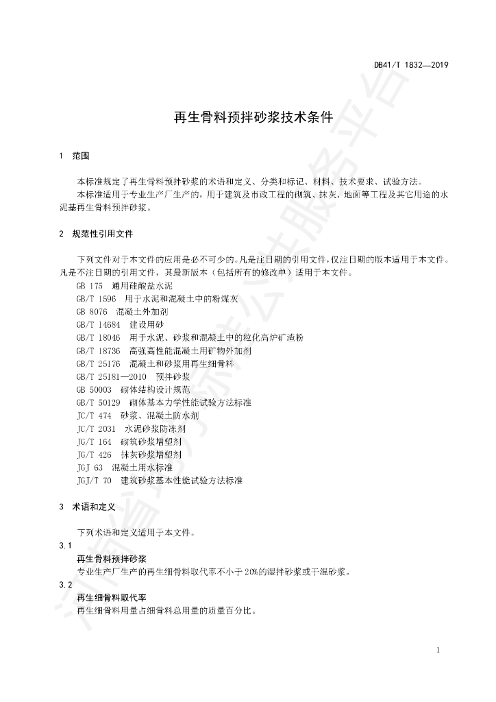DB41/T 1832-2019 再生骨料预拌砂浆技术条件