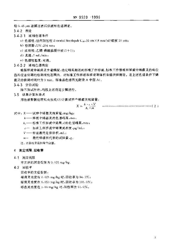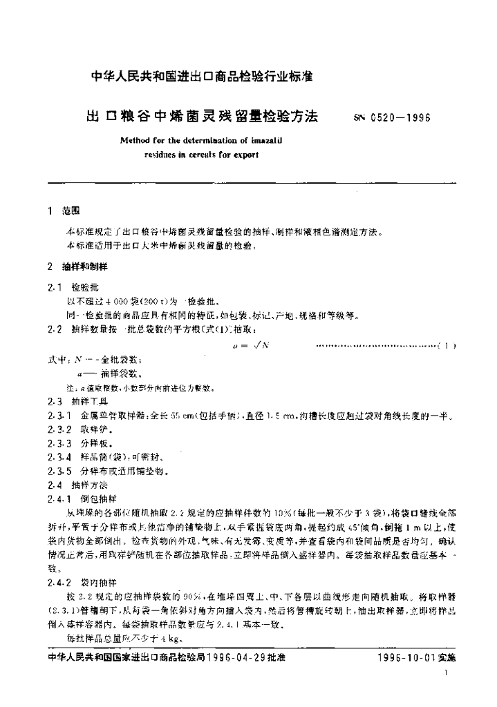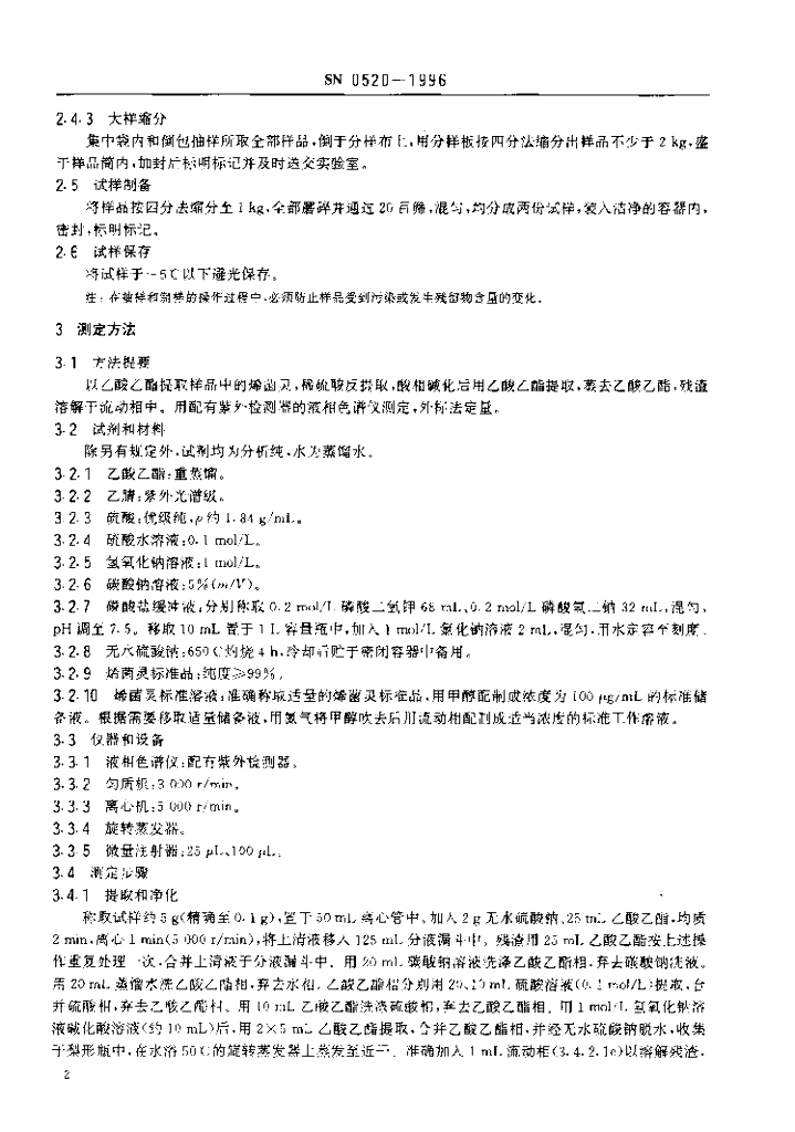 SN 0520-1996 出口粮谷中烯菌灵残留量检验方法