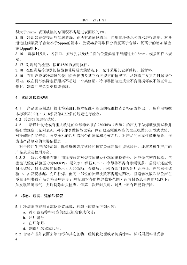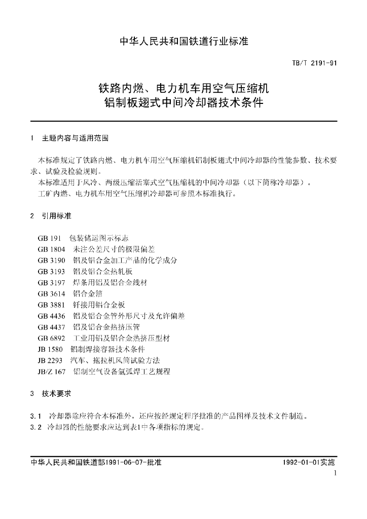 TB/T 2191-1991 铁路内燃、电力机车用空气压缩机铝制板翅式中间冷却器技术条件