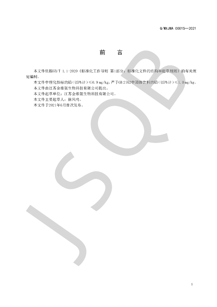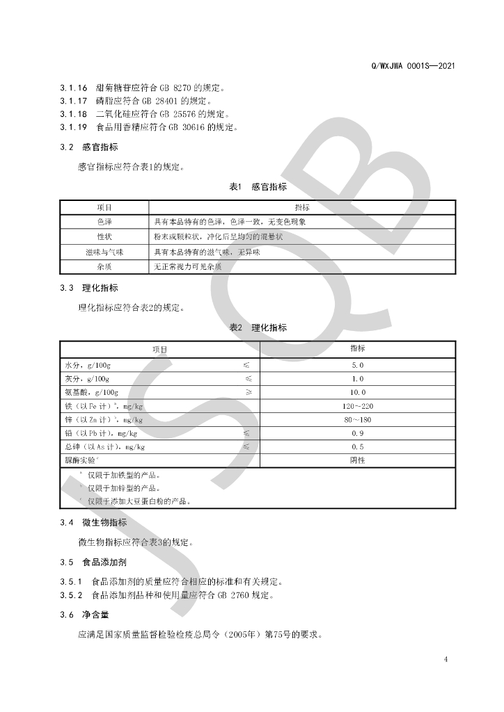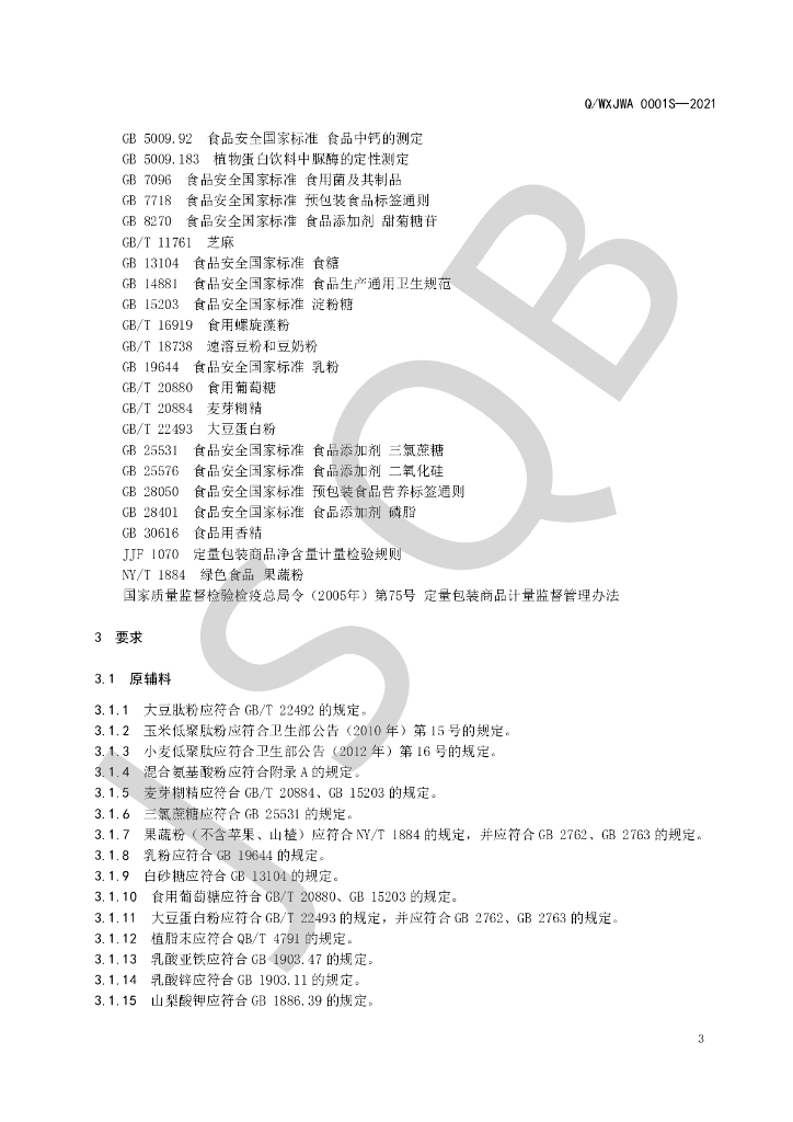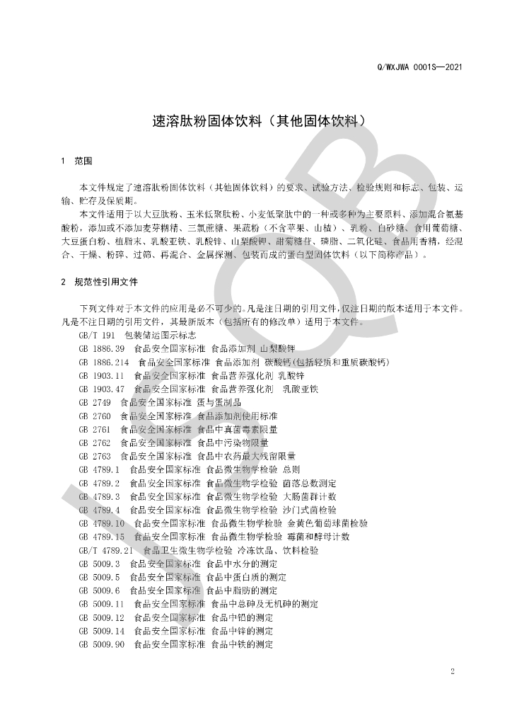 Q/WXJWA 0001S-2021 速溶肽粉固体饮料(其他固体饮料)