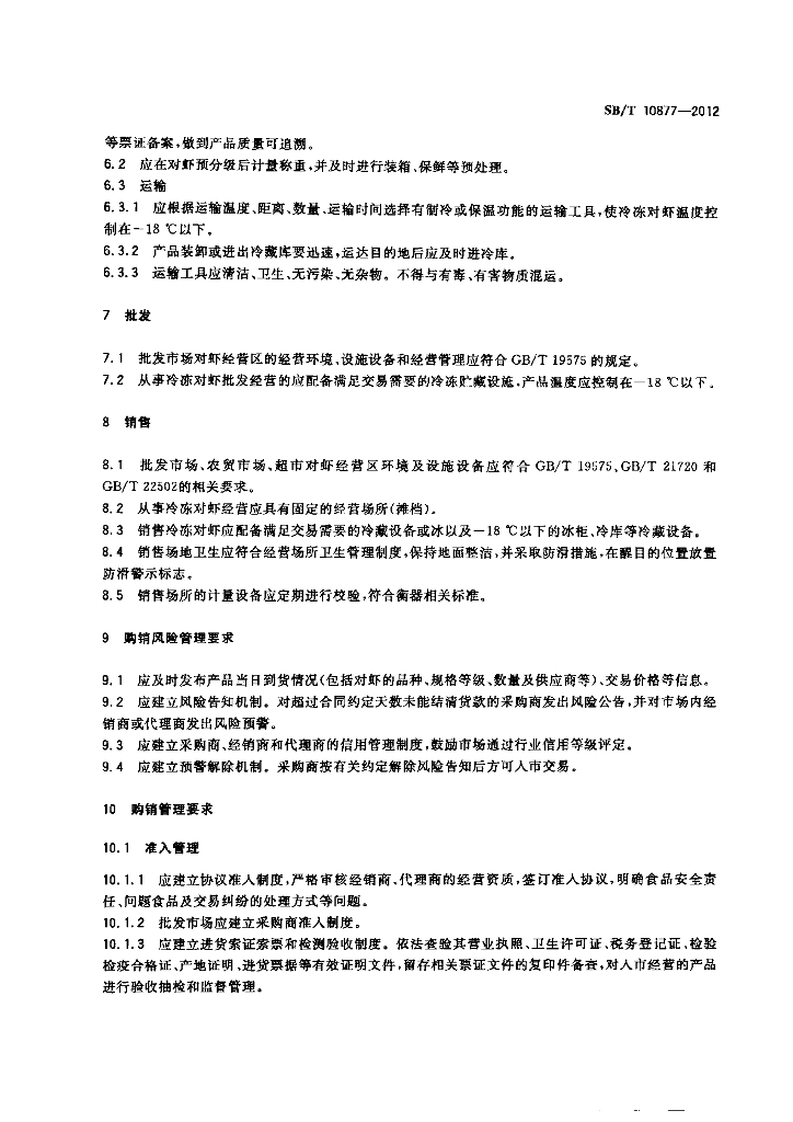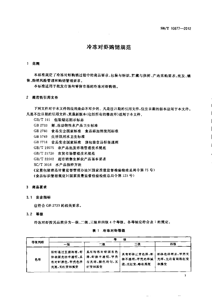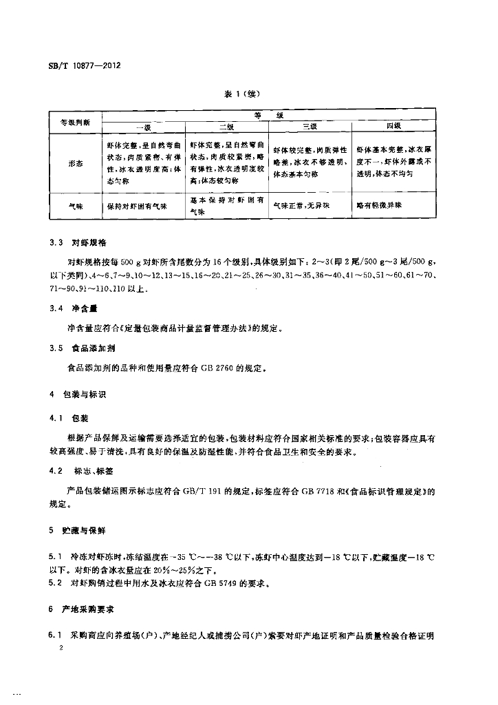 SB/T 10877-2012 冷冻对虾购销规范