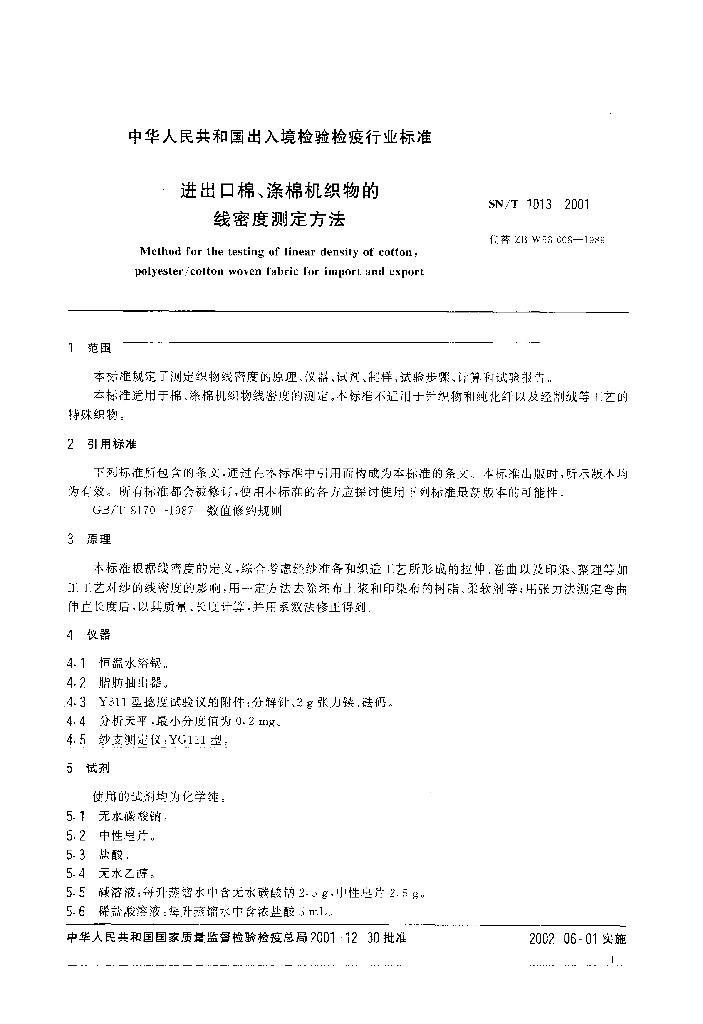 SN/T 1013-2001 进出口棉、涤棉机织物的线密度测定方法