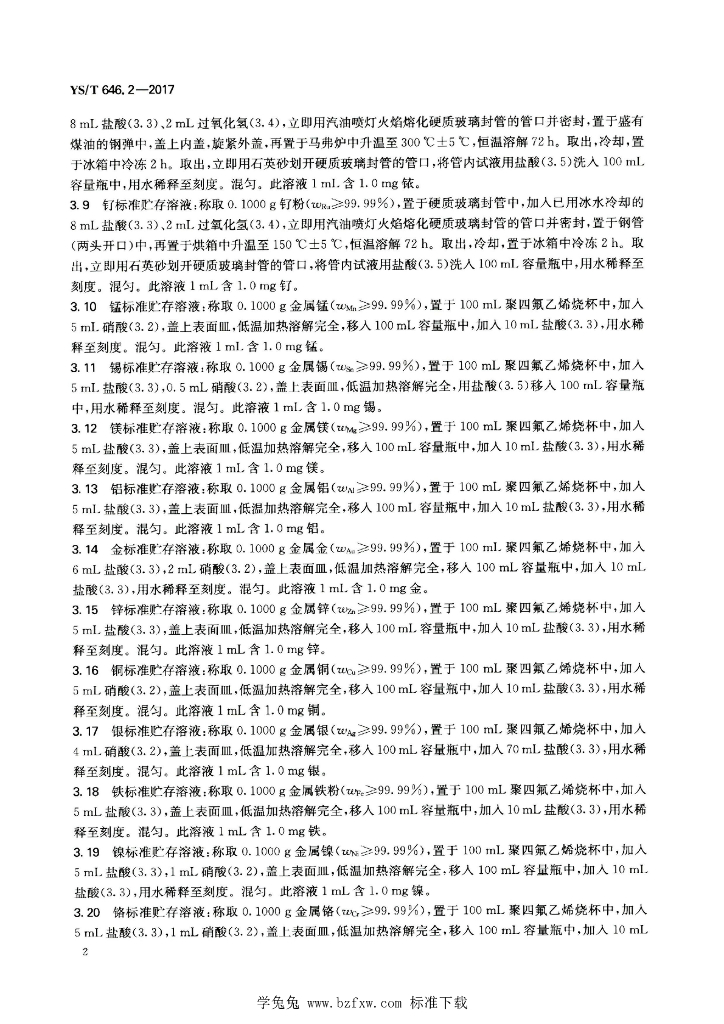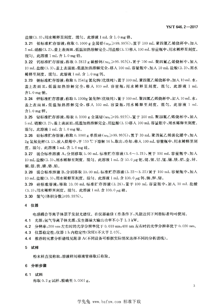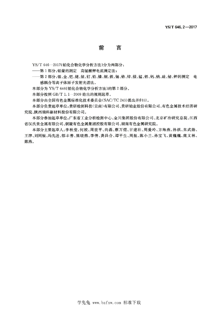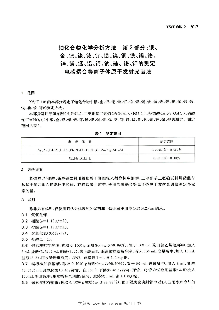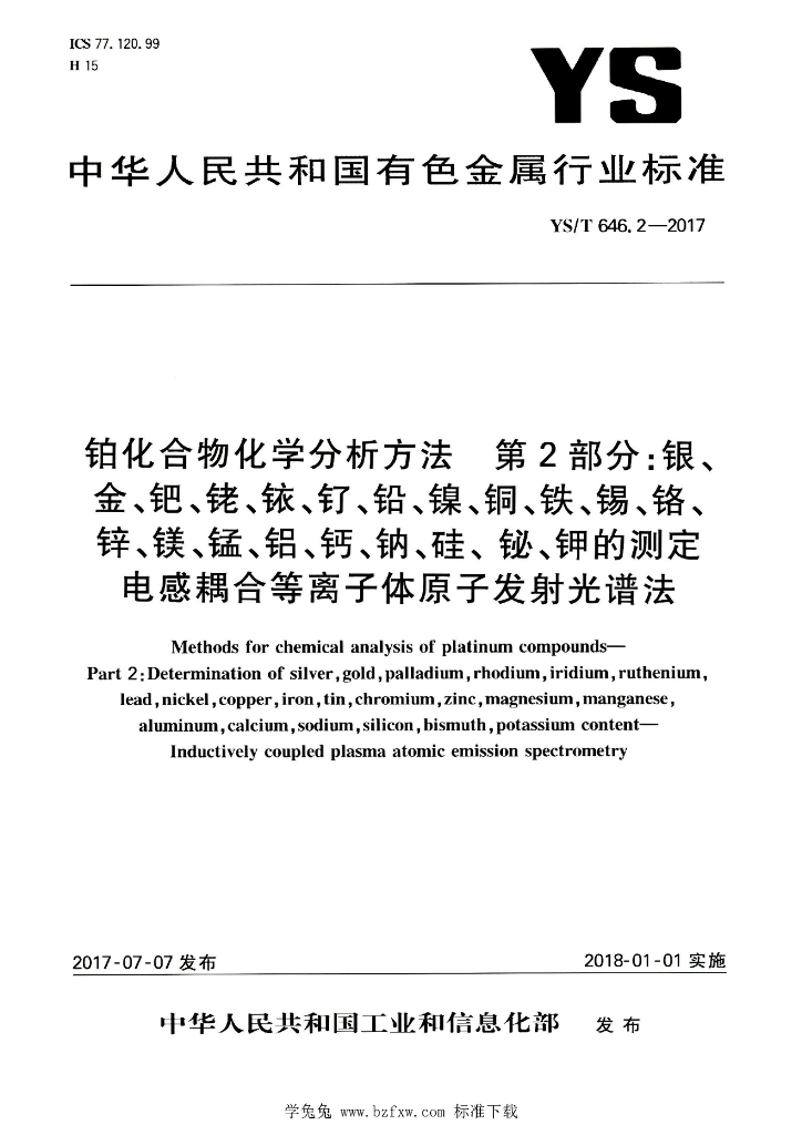 YS/T 646.2-2017 铂化合物化学分析方法 第2部分:银、金、钯、铑、铱、钌、铅、镍、铜、铁、锡、铬、锌、镁、锰、铝、钙、钠、硅、 铋、钾的测定 电感耦合等离子体原子发射光谱法