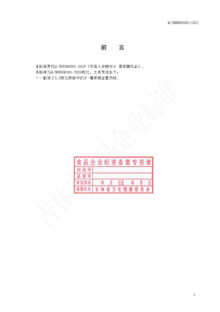 Q/XRKH 0030S-2021 雪莲人参酵母β-葡聚糖饮品