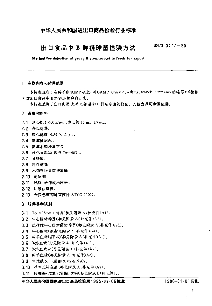 SN/T 0477-1995 出口食品中B群链球菌检验方法