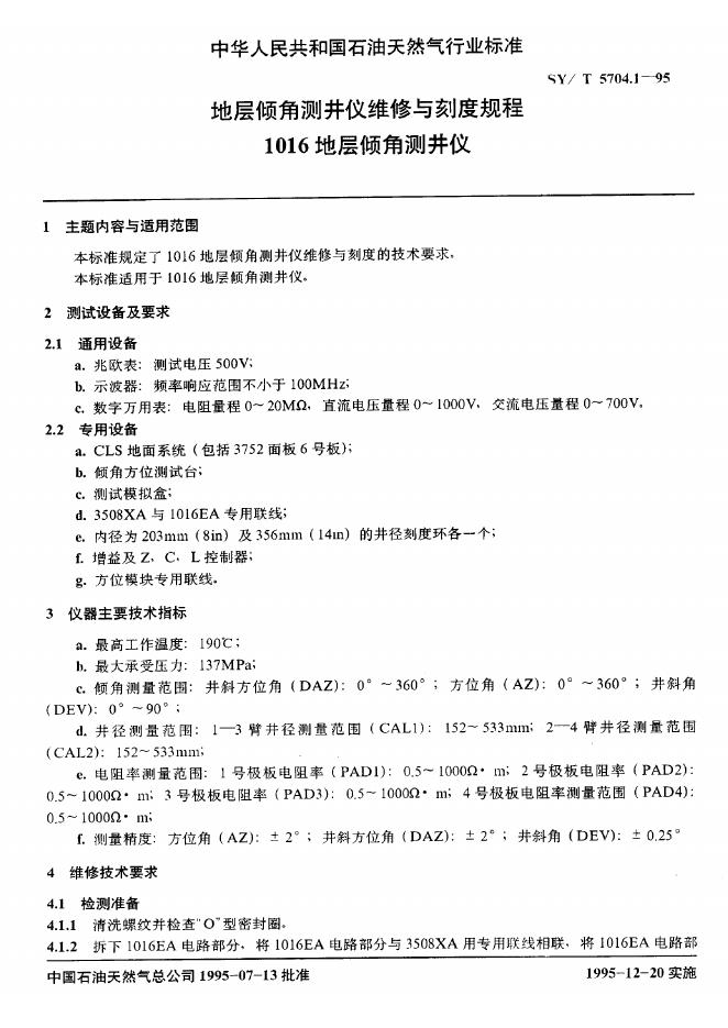 SY/T 5704.1-1995 地层倾角测井仪维修与刻度规程 1016地层倾测井仪
