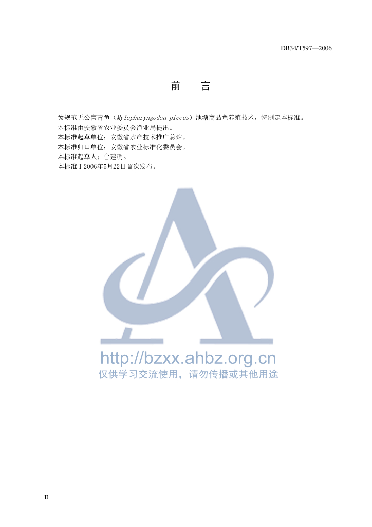 DB34/T 597-2006 无公害食品 青鱼养殖技术规范