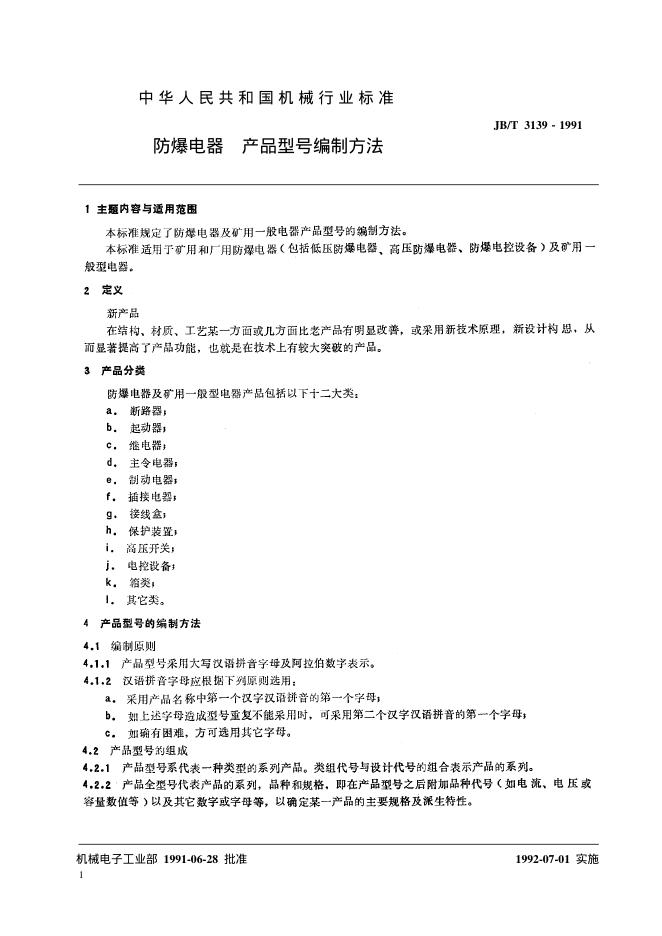 JB/T 3139-1991 防爆电器 产品型号编制方法
