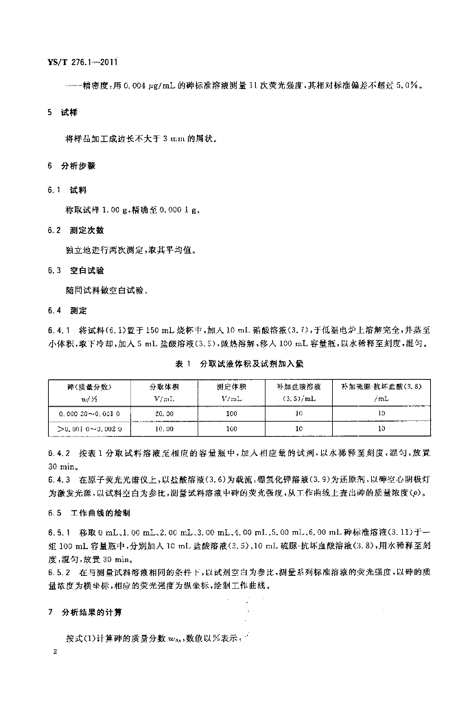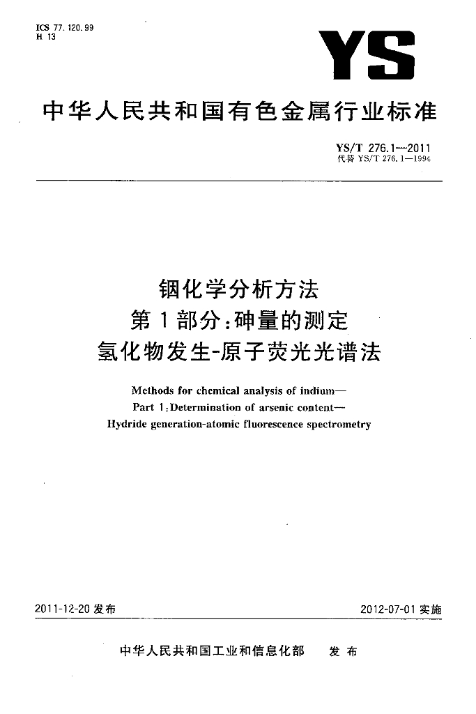 YS/T 276.1-2011 铟化学分析方法 第1部分:砷量的测定 氢化物发生-原子荧光光谱法